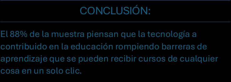 Nosotras hemos concluido que es muy importante la tecnología en la educación, la mayoría de los establecimientos educativos tienen acceso a plataformas virtuales que nos ayudan a aprender cosas de manera diferente, la tecnología es buena si se utiliza de la mejor manera y es peligrosa si no se utiliza correctamente.