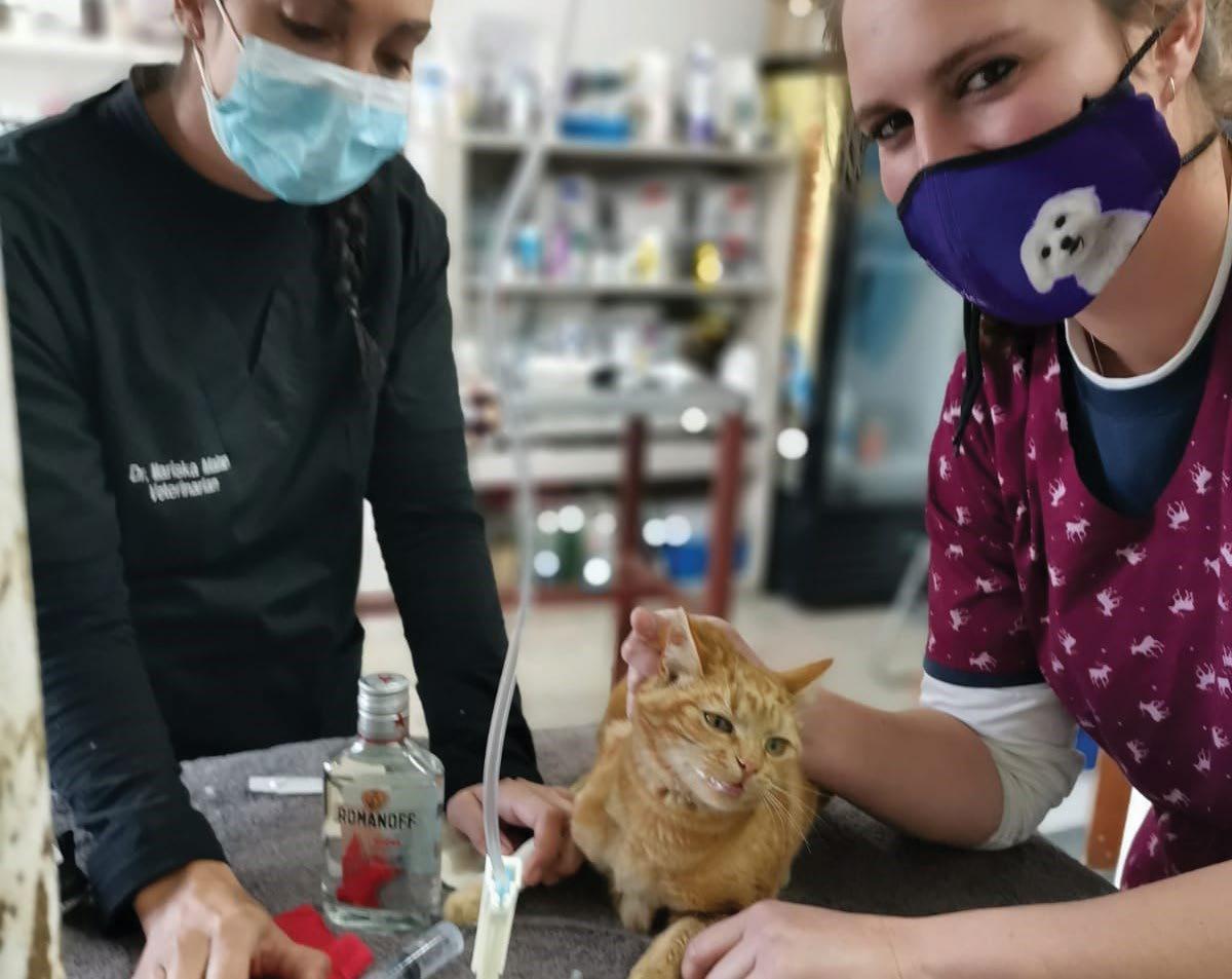 It is stories like these that just show how at even a small animal clinic in the middle of the Free State, South Africa, you can have great minds working quickly to figure out a problem and save an animal’s life. It all started when Babi was rushed to us by Jabu and Reitumetsie (who absolutely love their cat). Babi is known to be a fussy cat, but they became very concerned when he wasn’t eating and, in addition to that, he seemed very weak and feeble, barely able to stand. They scooped him up and carried him in their arms, almost 2kms through the valley, to get to us. Thankfully, Babi had been sterilised and vaccinated previously, so they knew exactly where we were! Thankfully, Dr Katherine was at the Cluny clinic in Fouriesburg with Dr Eunice Olevano (our CCS vet) and Dr Mariska Malan (CCS vet from Ladybrand), who had brought a dog for us to x-ray. The veterinary team immediately suspected poisoning, so Dr K did a cystocentesis (which involves the insertion of a needle through the abdominal and bladder walls to get a urine sample). The urine came out a funny lime/yellow colour! Immediately after she had taken the urine sample, Babi started to projectile vomit watery liquid. His urine tested very high for increased glucose levels. Initially they thought it might be diabetes, but Babi does not have a history of diabetes, and because he was acting and eating normally just the day before, that was quickly ruled out.