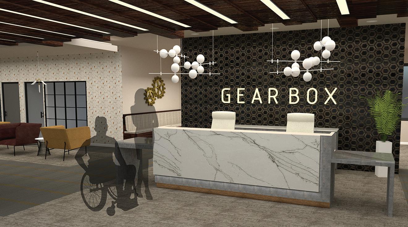 GEARBOX provides a flexible work environment with the option of benching stations, open and private collaboration spaces, lounge areas, auditorium, and rentable private offices and workstations.