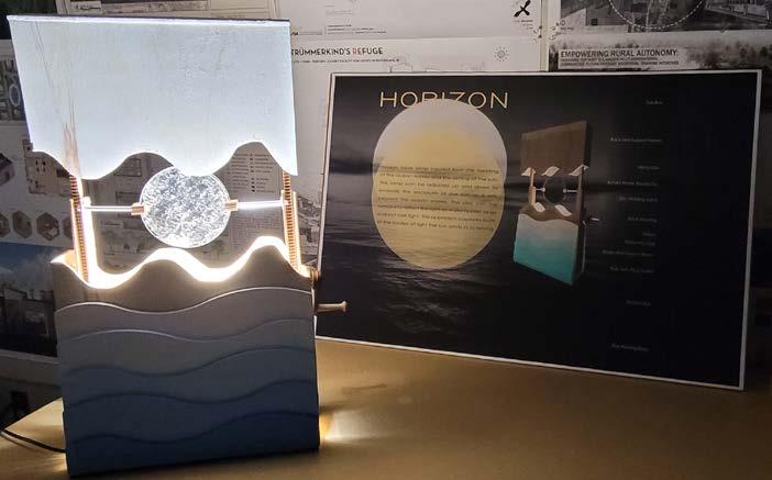 Assigned as a team project. The concept is to create a table lamp that is easy to engage with, and at the same time offer adequate lighting for the space. The user can engage with the lamp by choosing what type of lighting they are wanting to display in the space. They can either keep the light inside of the housing to give a reflection of a horizon or waves or the main light source can be removed out of it’s housing to give a soft solid reflection.
