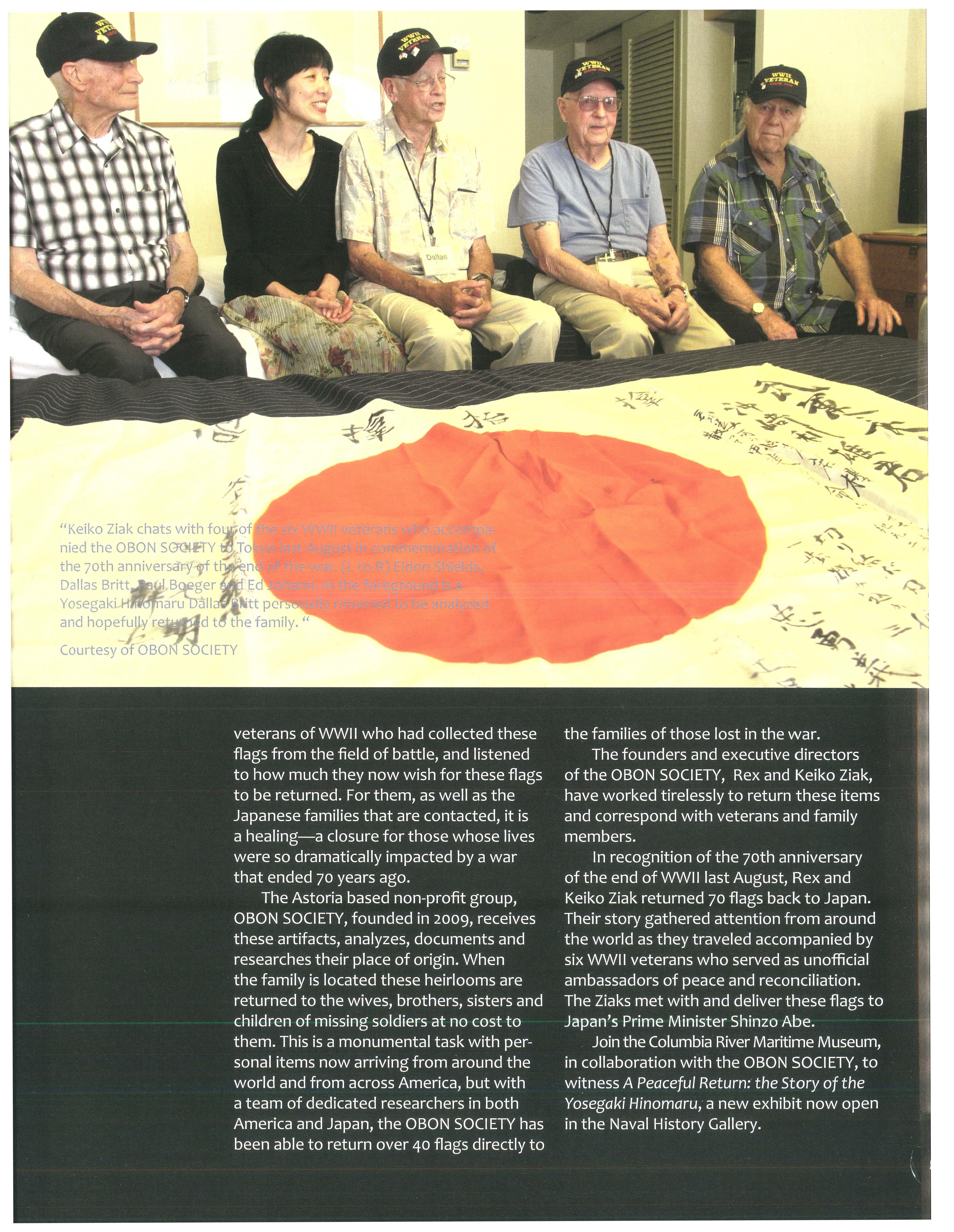 and those collected by Rex and Keiko Ziak of the OBON SOCIETY, present the moving story of Japanese flags that were taken as souvenirs during combat and then returned decades later to the Japanese families of those fallen soldiers.