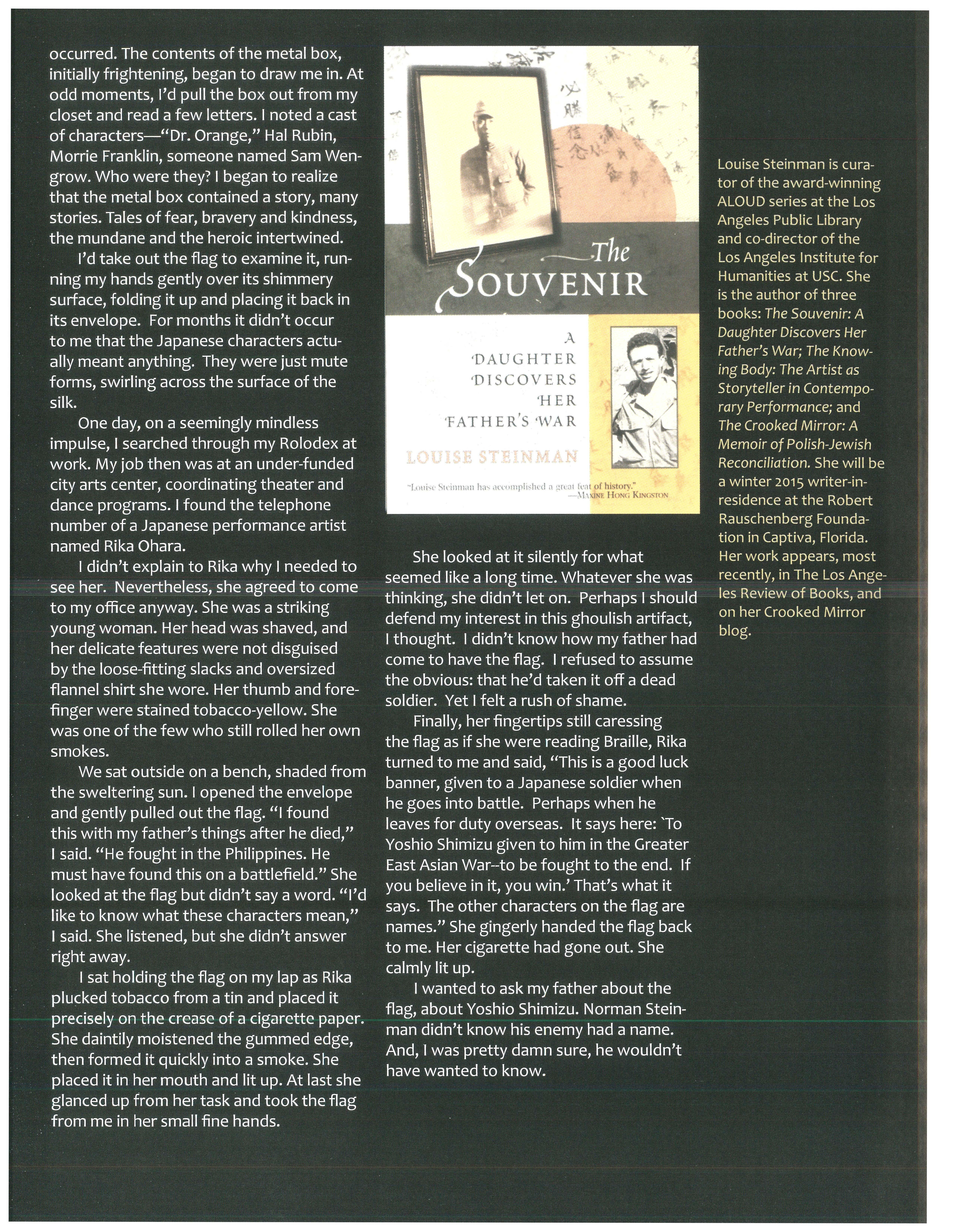 • We have a great start to the new year planned, welcoming author Michael J. Tougias to speak on January 2, 2016. Mr. Tougias is the author of several sea-related books and will talk about The Finest Hour (now a Disney movie slated to be released in January) and his more recent work Rescue of the Bounty. We welcome Louise Steinman on February 2nd. Ms. Steinman will be talking about her intimate and powerful story that will make the Yosegaki Hinomaru story come to life with her work The Souvenir.