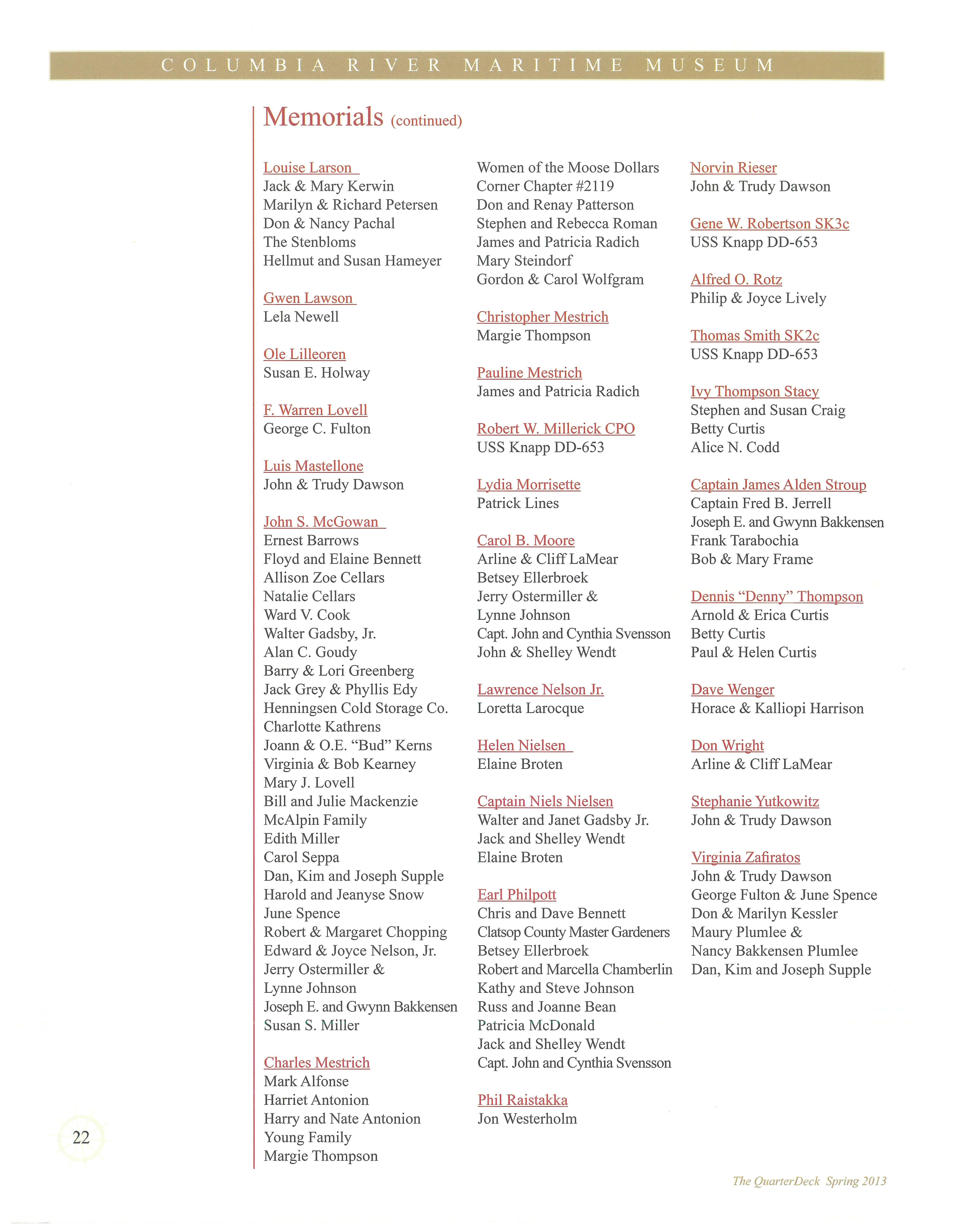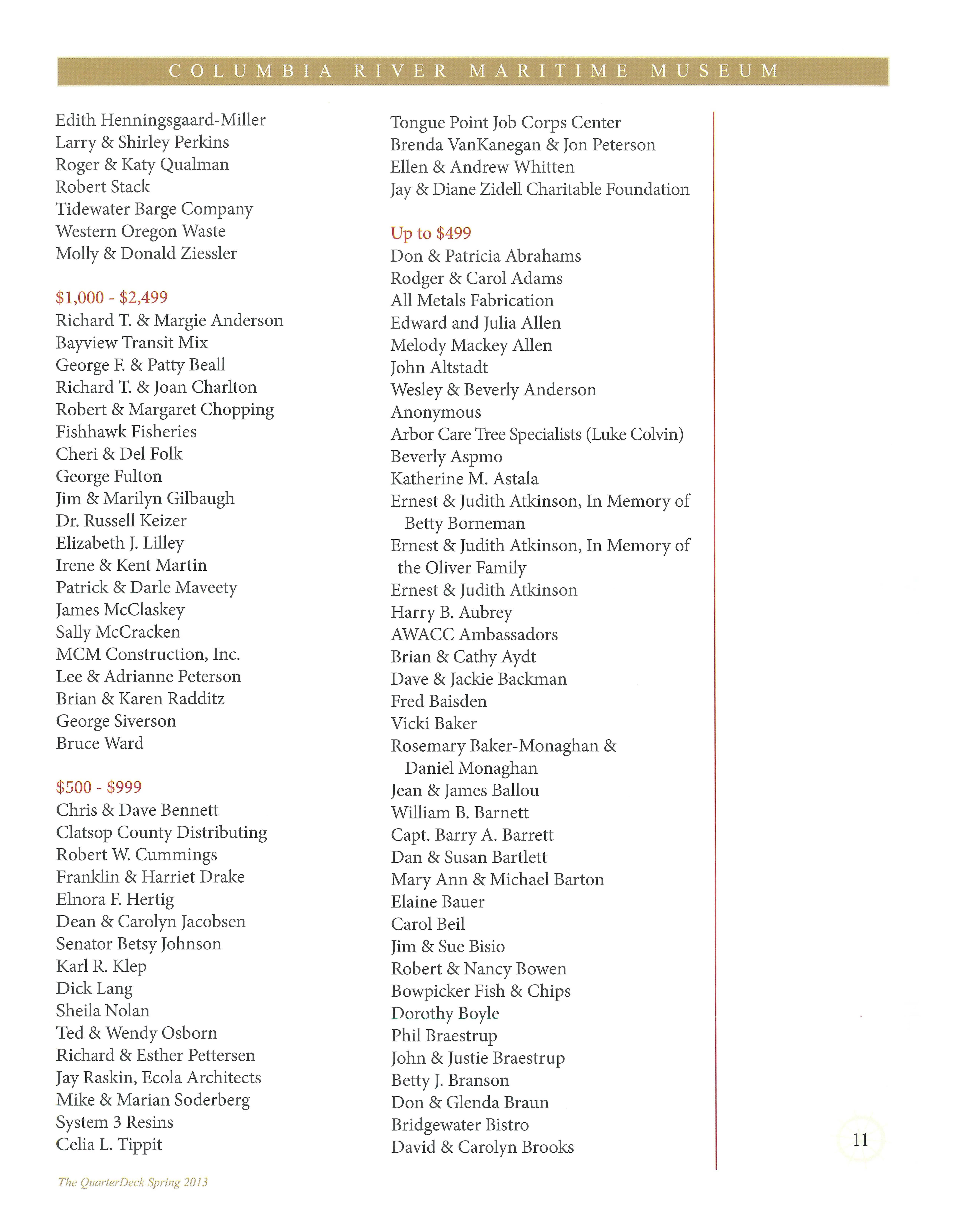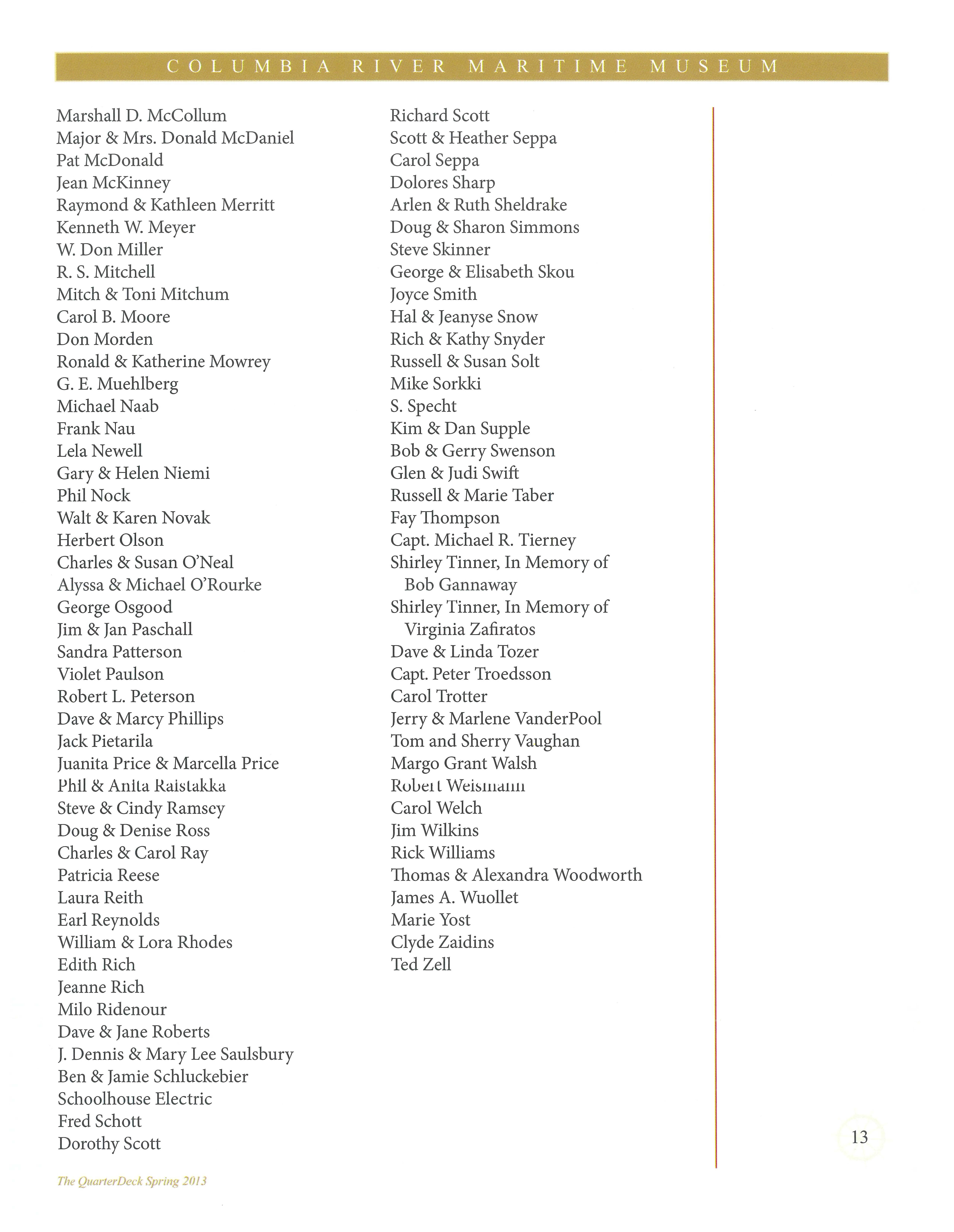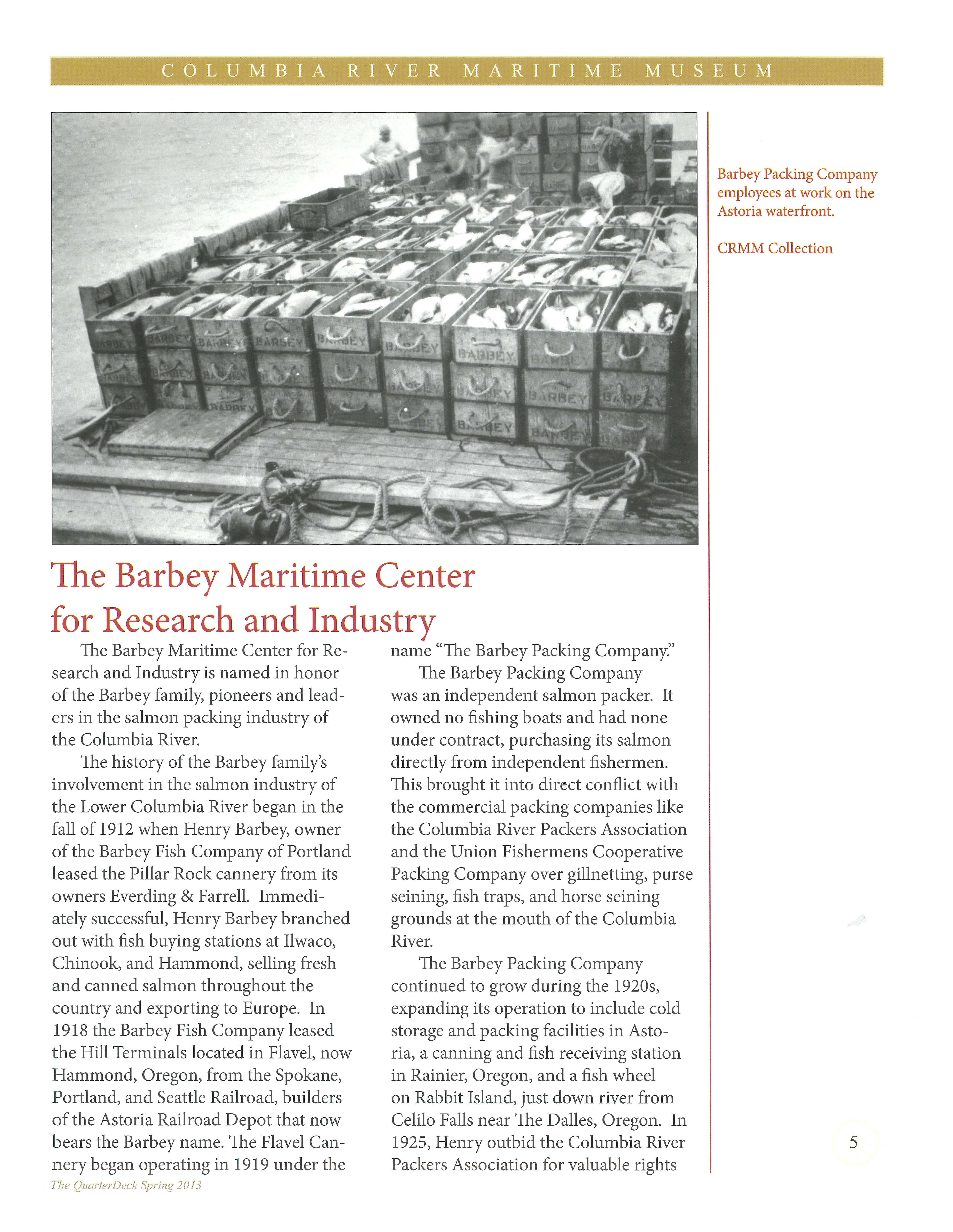 The Columbia River Maritime Museum is proud to recognize the Barbey Family for their contributions to the maritime culture of Astoria and the Columbia River region and for their support of the Columbia River Maritime Museum and its efforts to preserve the culture of the Columbia River and the waters of the North Pacific.