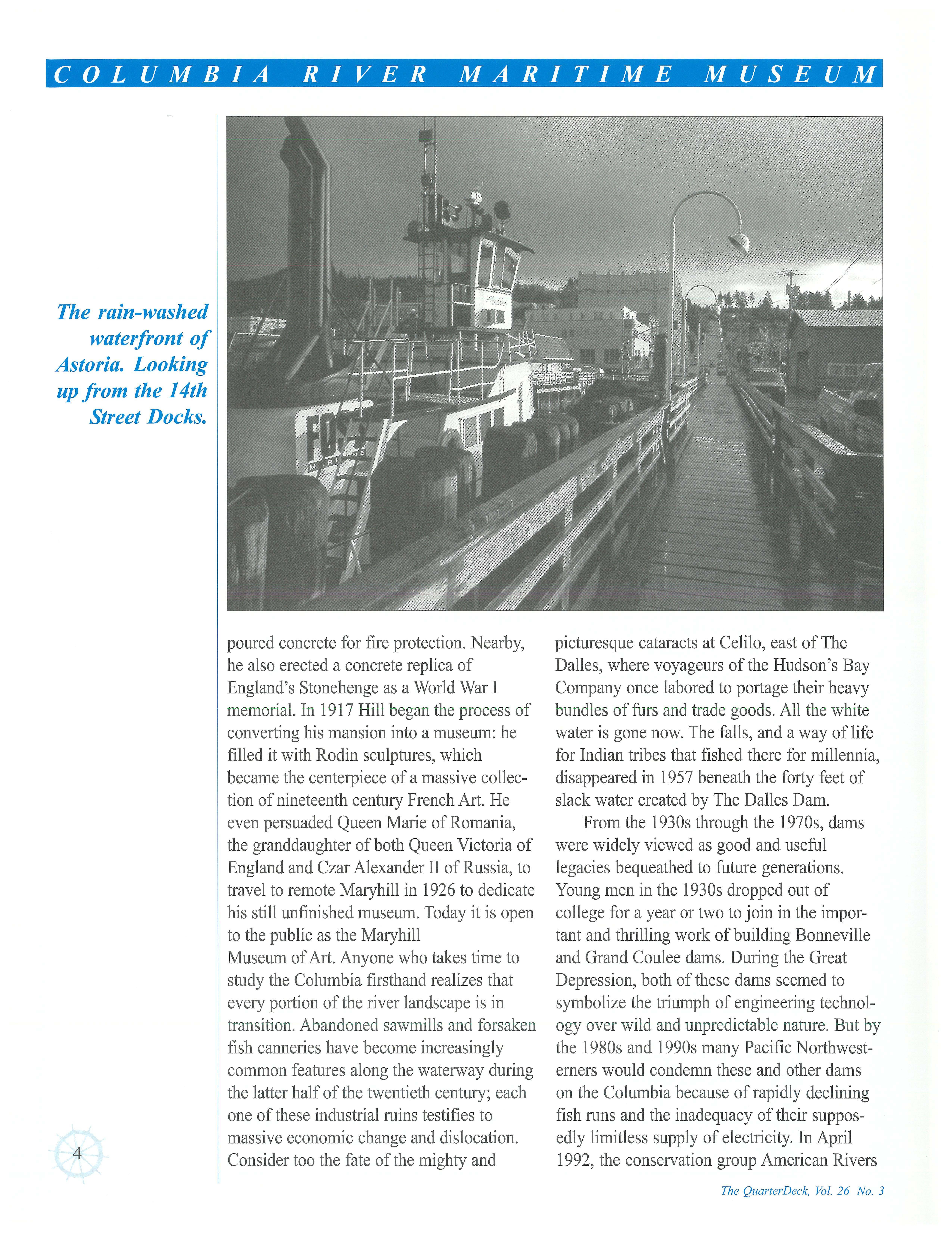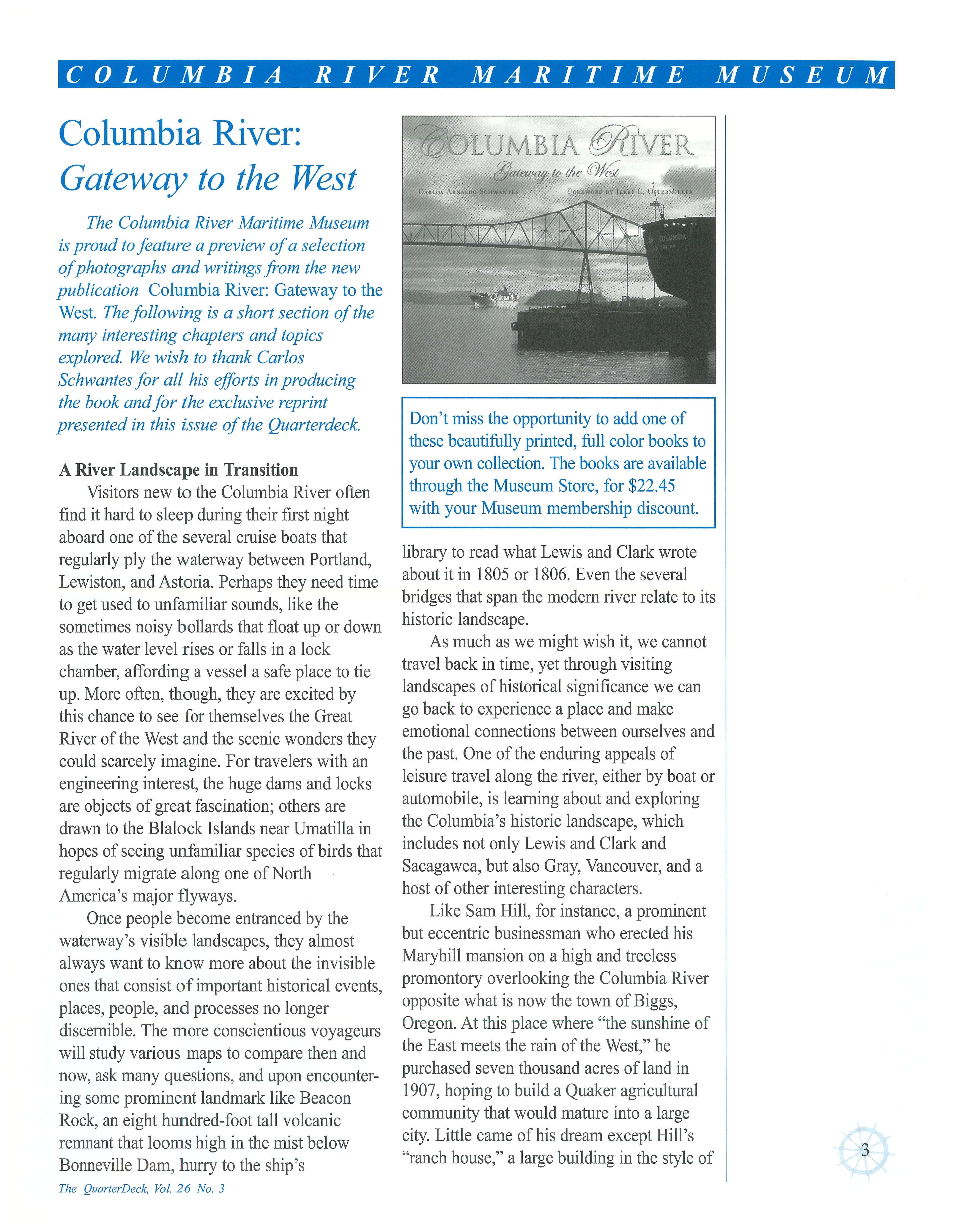 The Columbia River Maritime Museum is proud to feature a preview of a selection ofphotographs and writings from the new publication Columbia River: Gateway to the West. The following is a short section of the many interesting chapters and topics explored. We wish to thank Carlos Schwante s for all his efforts in producing the book and for the exclusive reprint presented in this issue of the Quarterdeck.