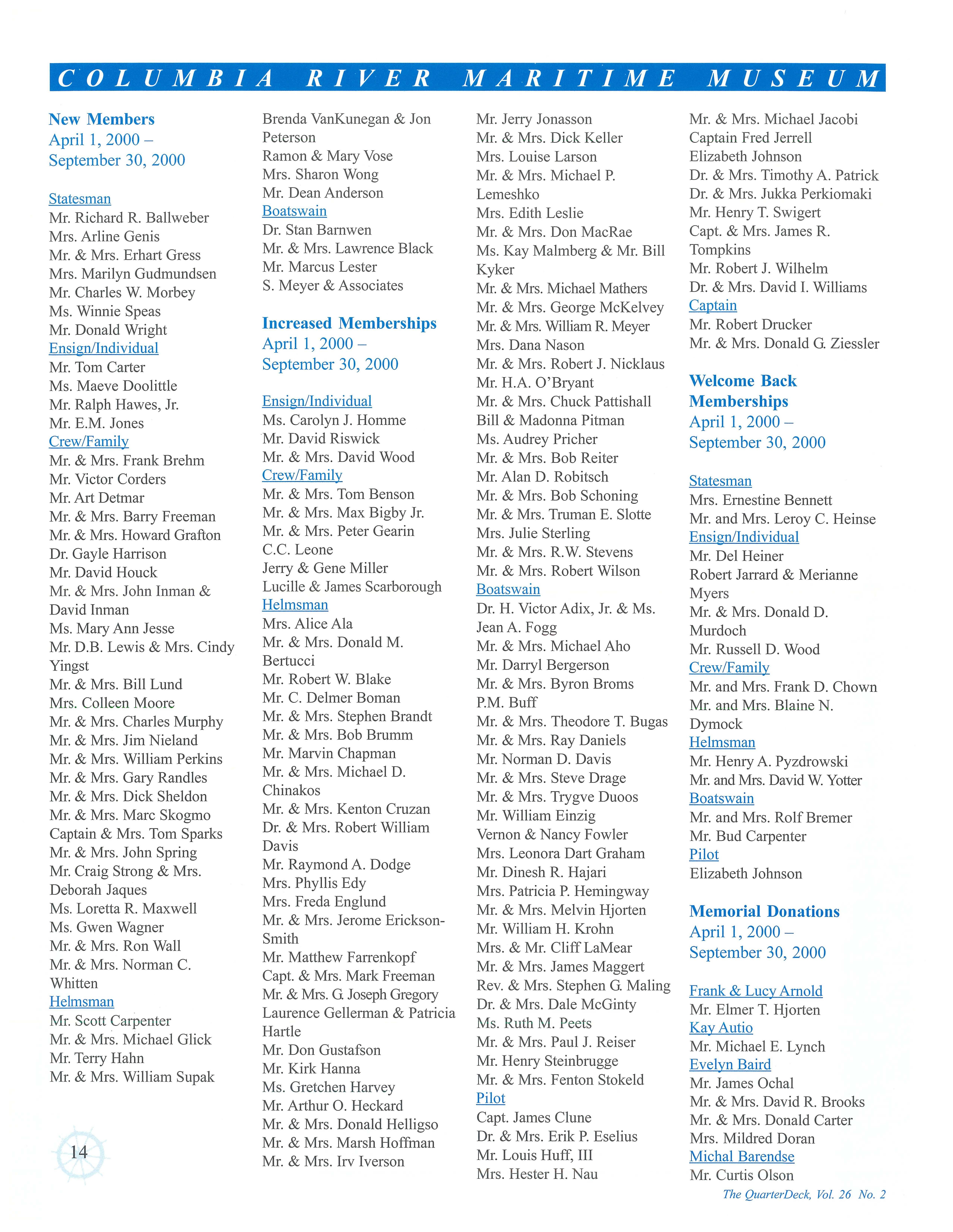 April 1, 2000 Peterson Mr. & Mrs. Dick Keller Captain Fred Jerrell September 30 , 2000 Ramon & Mary Vose Mrs Louise Larson Elizabeth Johnson Mrs Sharon Wong Mr. & Mrs . Michael P. Dr. & Mrs. Timothy A. Patrick Statesman Mr. Dean Anderson Lemeshko Dr. & Mrs. Jukka Perkiomaki