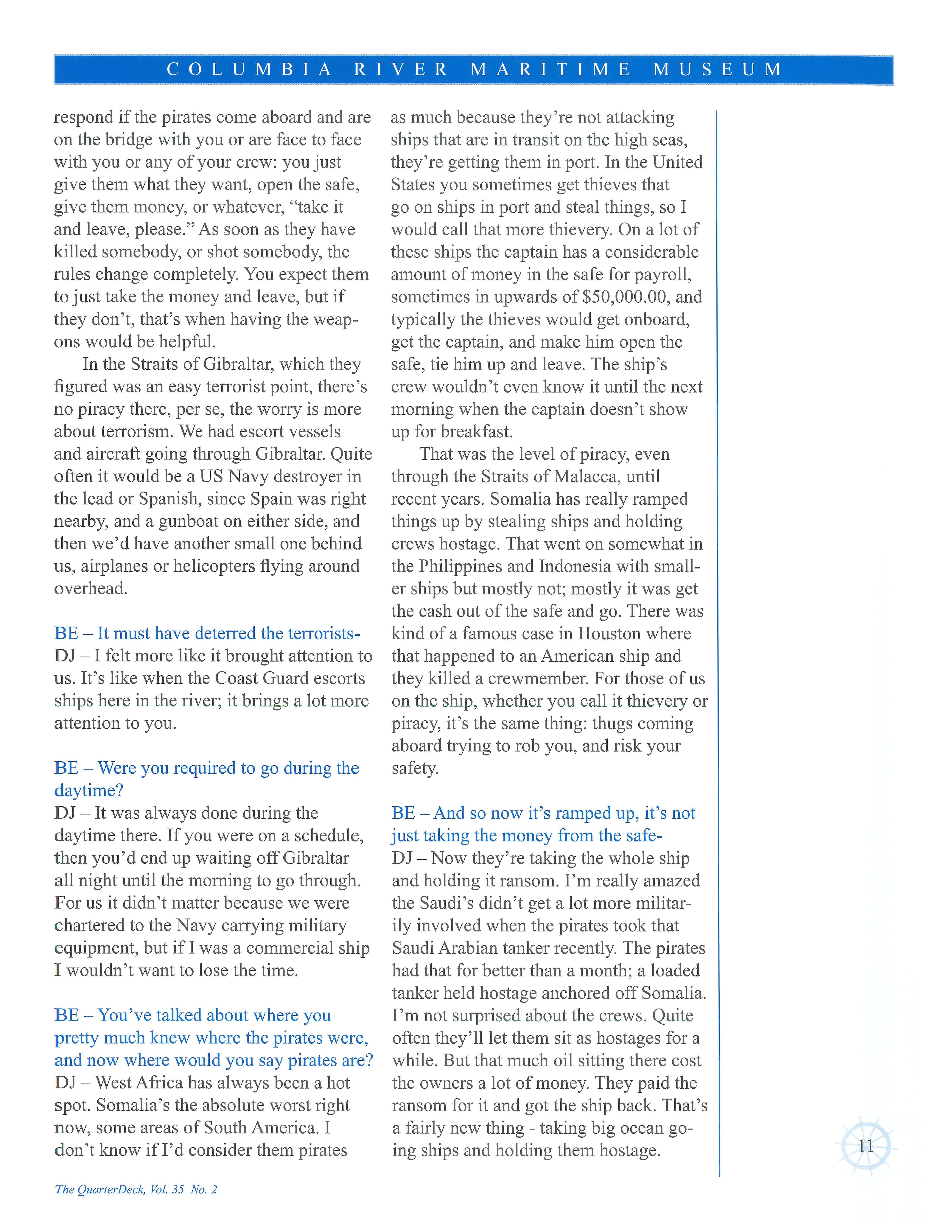 pirates abounded; I even had a few of my own. Now, when I read of the events off Somalia, I am struck that my brethren who are still out there are being dealt an impossible hand in trying to combat these thugs. Merchant seamen are working men from around the world who want no part of this drama. They just want to do their jobs and safely navigate the world's commerce. Depending upon the owner of their ship, they may get good support, or more likely something similar to the comment I heard from a Captain recently: "None of our ships have been taken yet; please be careful, Captain." If the recent events raise awareness and result in action, the world's seafarers will be safer transiting sea lanes to carry cargo to the world's consumers all of us. The following is an Oral History interview with Columbia River Bar Pilot Captain Dan Jordan, interviewed by Betsey Ellerbroek, Education Director. Captain Jordan spent over 24 years at sea and has many stories to tell of the realities of taking a merchant ship across the oceans of the world and the risk of piracy.