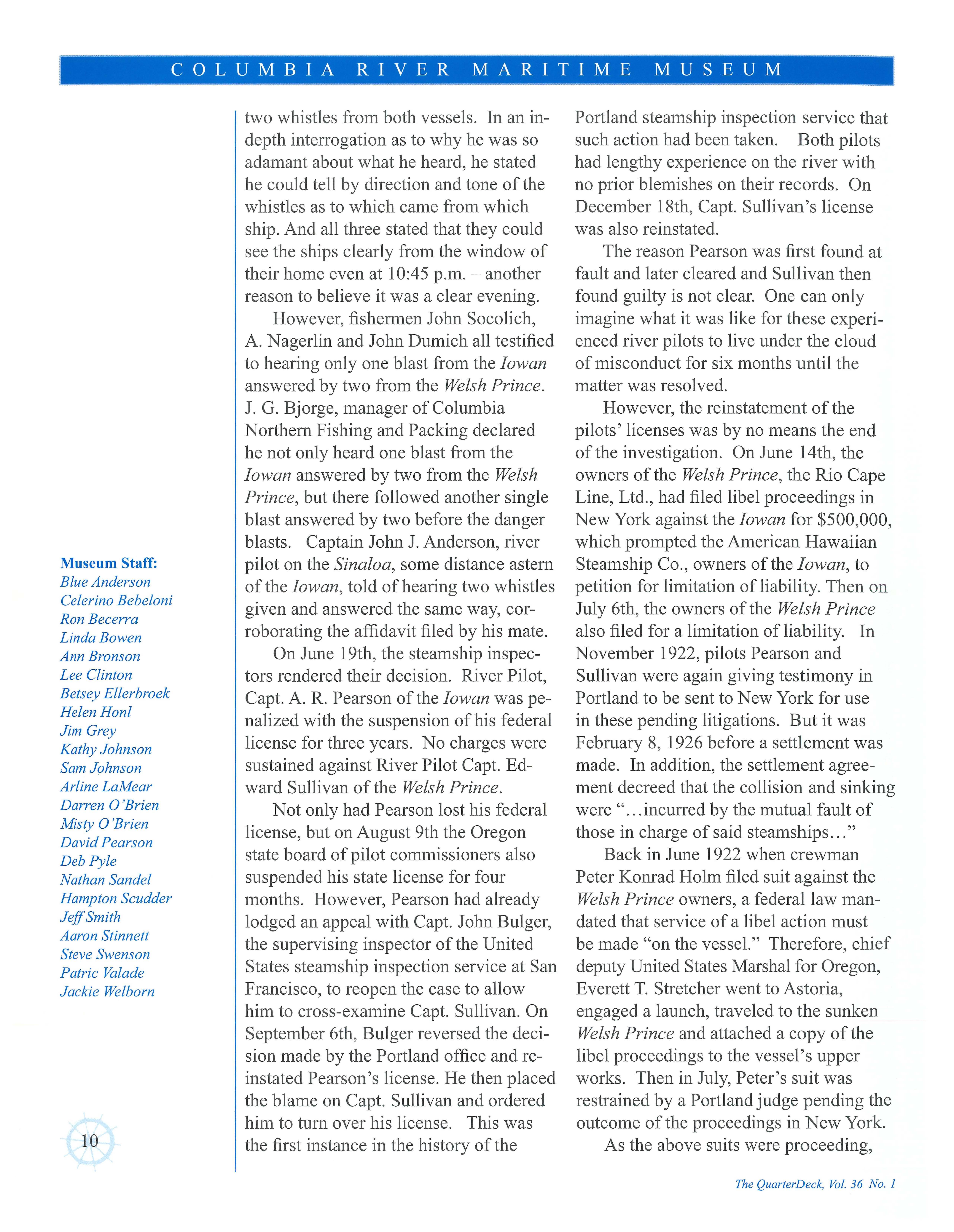 determine the responsibility of the two river pilots; Captain A. R. Pearson of the Iowan and Captain Edward Sullivan of the Welsh Prince. Testimony was heard from the river pilots and both ship crews and masters. After hearing all the testimony, the steamship inspectors brought formal charge of misconduct against both river pilots and both were put on trial.