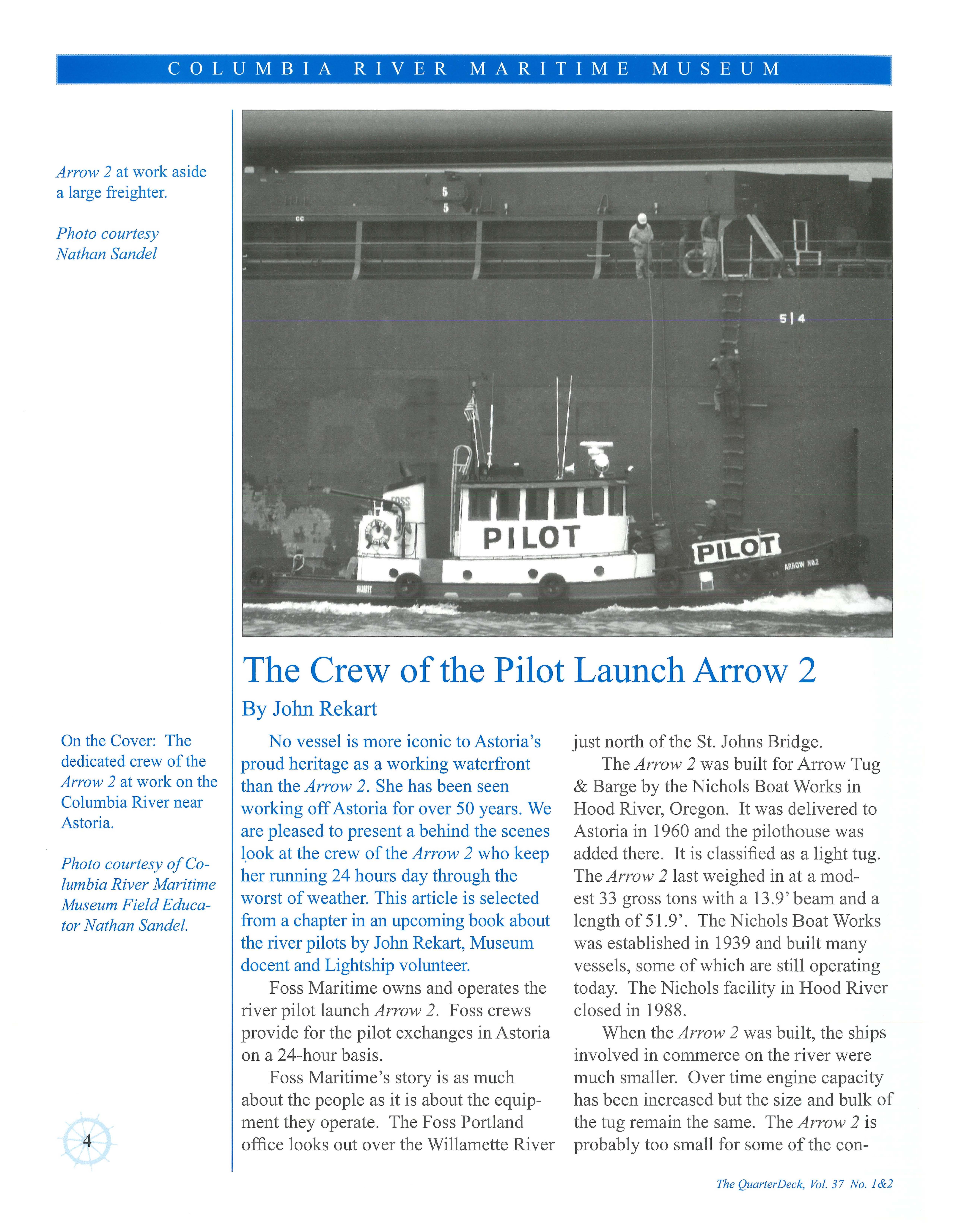Executive DirectorNo vessel is more iconic to Astoria's proud heritage as a working waterfront than the Arrow 2. She has been seen working off Astoria for over 50 years. We are pleased to present a behind the scenes l_ook at the crew of the Arrow 2 who keep her running 24 hours day through the worst of weather. This article is selected from a chapter in an upcoming book about the river pilots by John Rekart, Museum docent and Lightship volunteer.