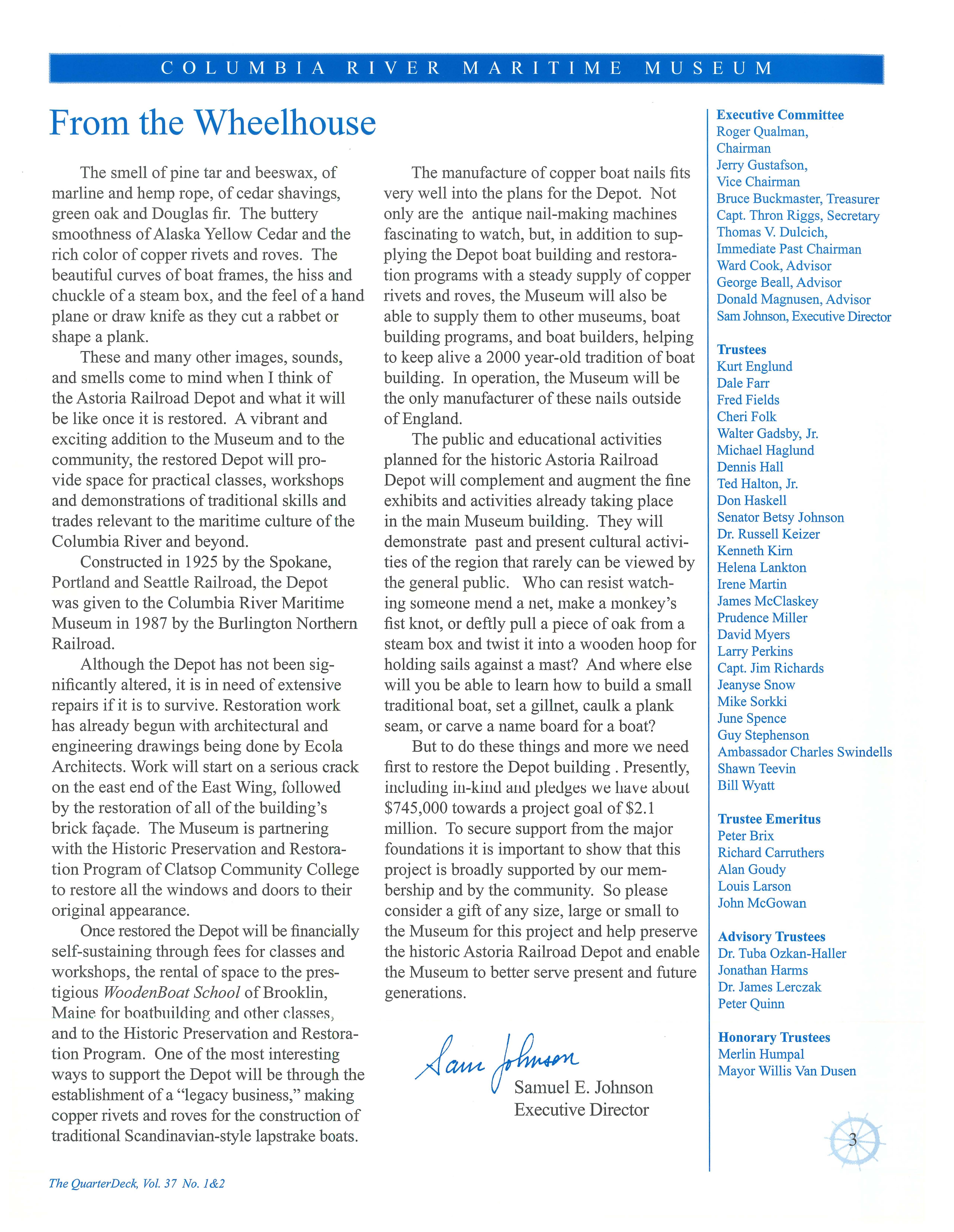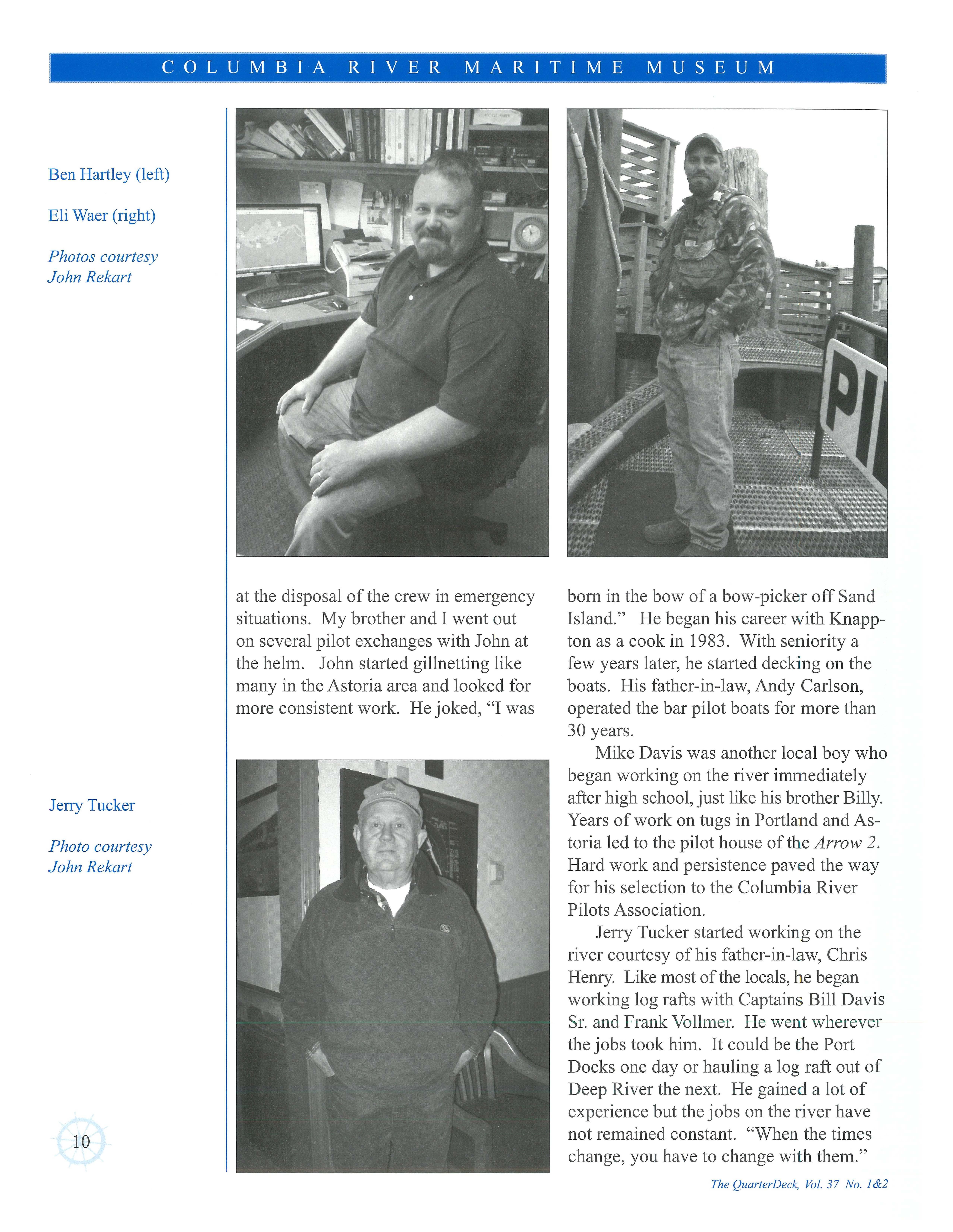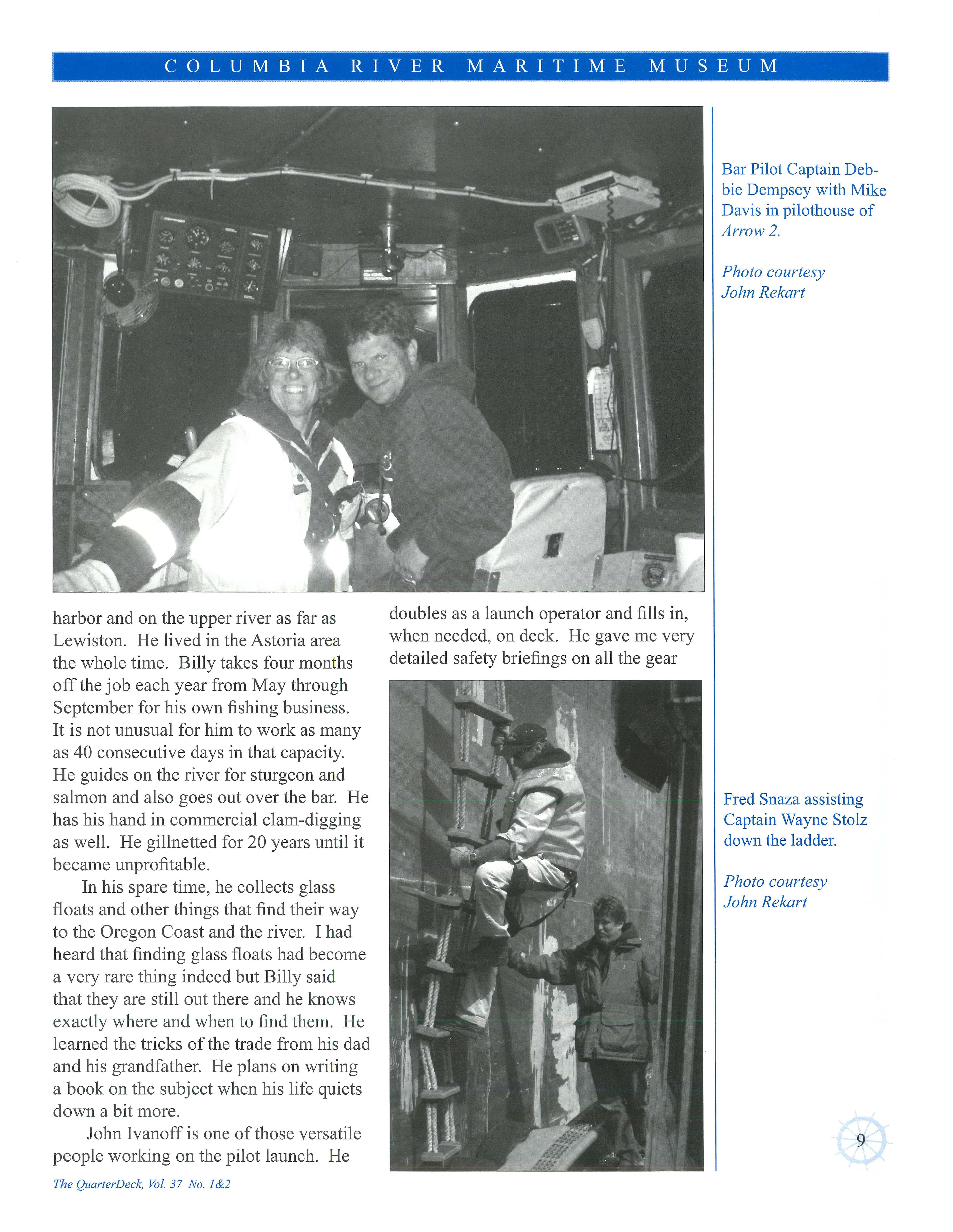 Fred came back to the area later and did a lot of logging for Weyerhaeuser on Mount St. Helens before it erupted Narrowly missing that cataclysmic event, he sought safer work. With the help of a librarian in Longview, he began a search for a new career. River jobs seemed atThe QuarterDeck, Vol 37 No. 1&2