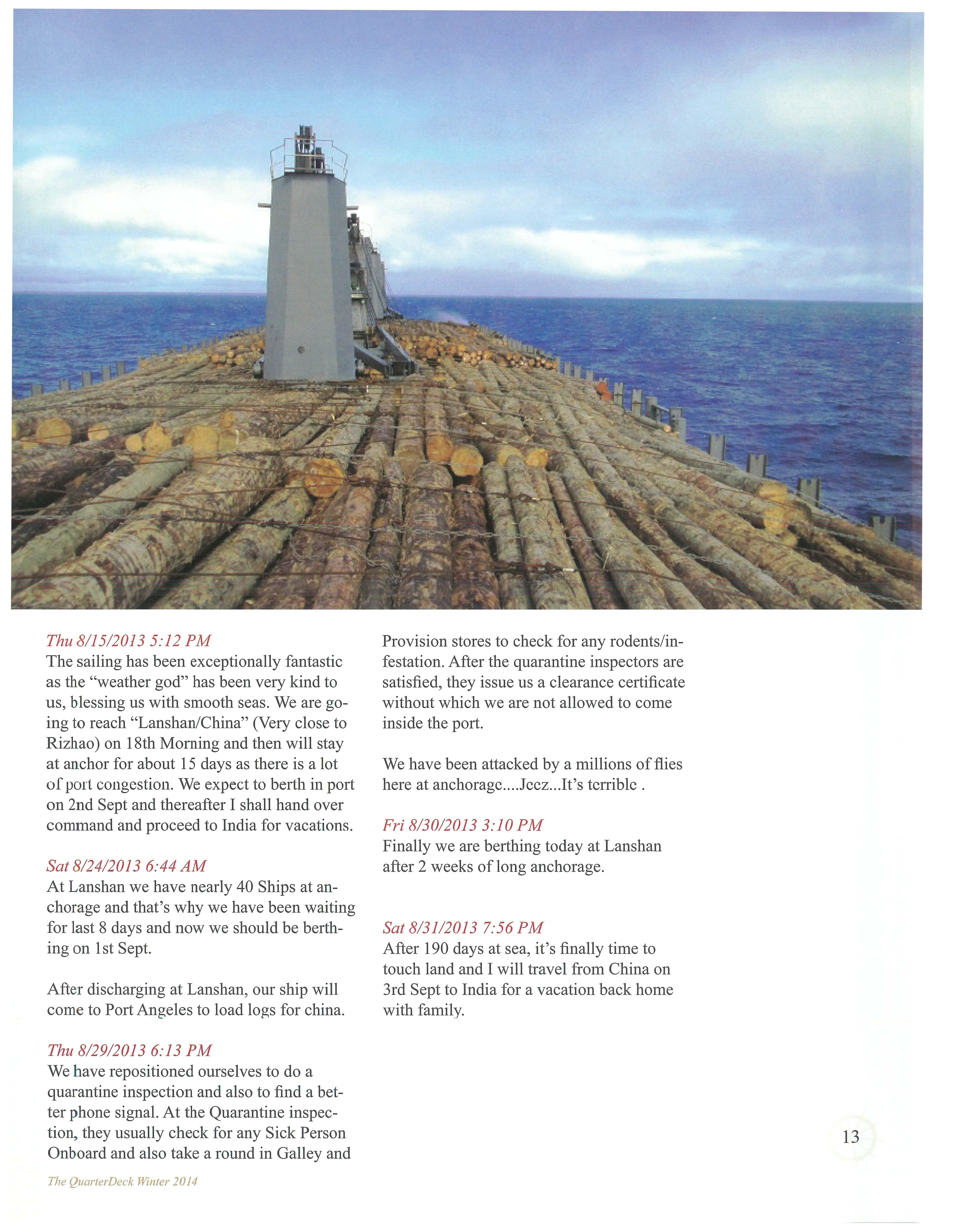 The return trip of Ocean Harmony was documented through e-mails from Capt Agarwal. Here are some excerpts showing the return trip to deliver the load of logs to China.
