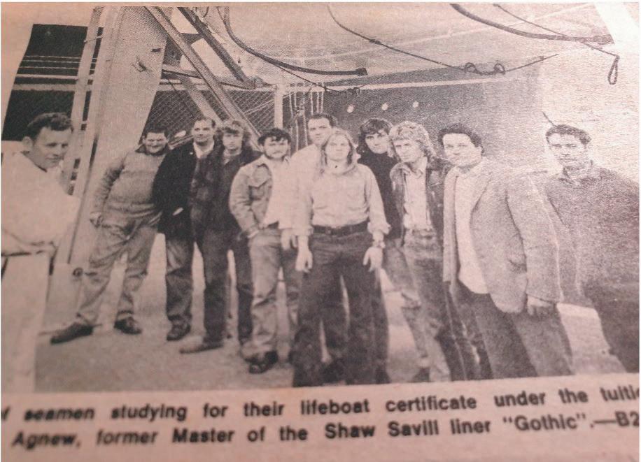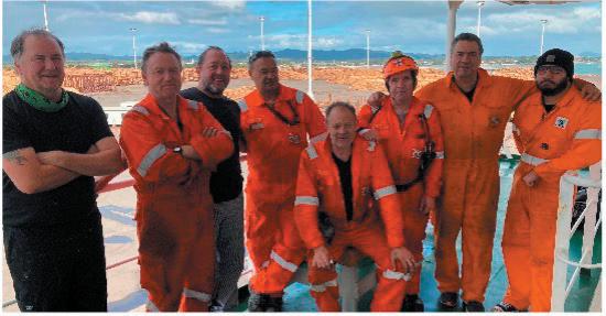 Left to right: Figures in this photo include Captain Agnew, Terry Neilson, Darryl Barlow, Jimmy Mobbs, Pat Harcus. Pat Harcus Bosun, Maersk NanshiAs a quartermaster on ferries crossing Cook Strait, Mick Williams can remem ber times when waves would surge over the bow of a ferry as the ship crashed down on to the water.