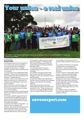 Meat Workers Union delegates join Maritime Union Local 13 members at Teal Park, Ports of Auckland, 5 October 2012 (photo by Dave Phillips) By Garry Parsloe National President The Maritime Union of New Zealand is a union with a long and proud tradition. As a real union we are committed to principles of collectivism – standing together working in the best interests of all our members. As a real union we are independent of the employer – what we do is not determined by the employer but democratically by our members – members like you. You know that we will confront those who attack us and who try to undermine our conditions and make things worse for us and our families. That’s what we have all been doing over the last year, those who are members of MUNZ have proudly stood up to attacks on us and our families. We have managed to stop a mass dismissal that POAL would have actioned in March of this year. We will get a collective agreement that is fair and protects the rights that enable us to have security while being flexible and achieving a good outcome for our owners, the people of Auckland. A real union like MUNZ acts together – an attack on one is an attack on all. You have seen a great deal of support from MUNZ members outside of POAL and in the wider union movement in NZ and internationally because of this principle.
