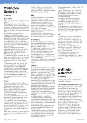Offshore The bulk of seafarers who were gainfully employed over the past several months in Australia are now back home waiting for more work opportunities to arise. There were indications given to MUNZ at a series of meetings held in Australia late last year and earlier this year that there would be ongoing work for us. A number of contributing factors has lead to the current downturn. One issue is the Tender process with all the players in the industry vying for contracts. Another danger and a very real one is the issuing of 457 visas to foreign nationals to work for lesser terms and conditions. Hopefully this will soon be resolved resulting in more employment for MUNZ members. In April the drilling vessel Noble Discoverer operating in the Taranaki offshore alongside the Maui gas field had to head into deeper water after some of the anchor cables snapped as the vessel rolled in seven metre seas. These were whipped up by a storm that caused major damage throughout the Taranaki region. On the plus side, none of the 114 personnel was injured in what would have been a scary time given the fact that the vessel is an old log ship with a 35 metre drill derrick sitting mid-ship.
