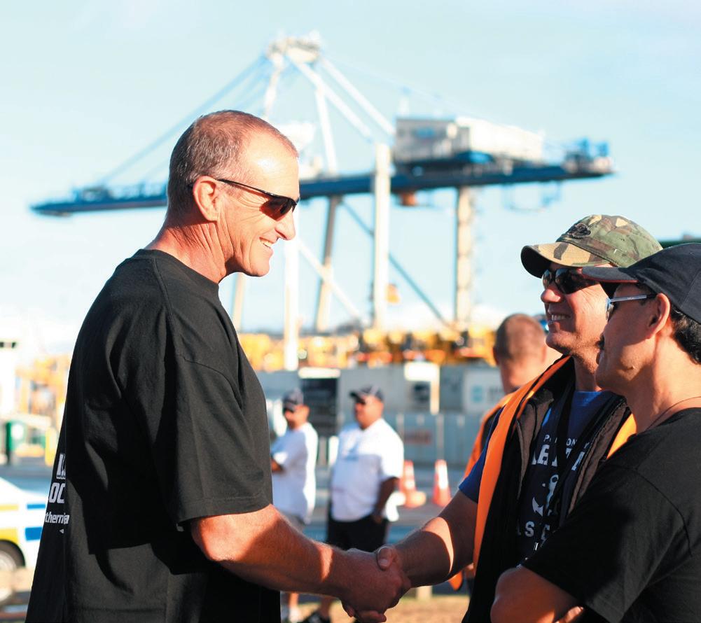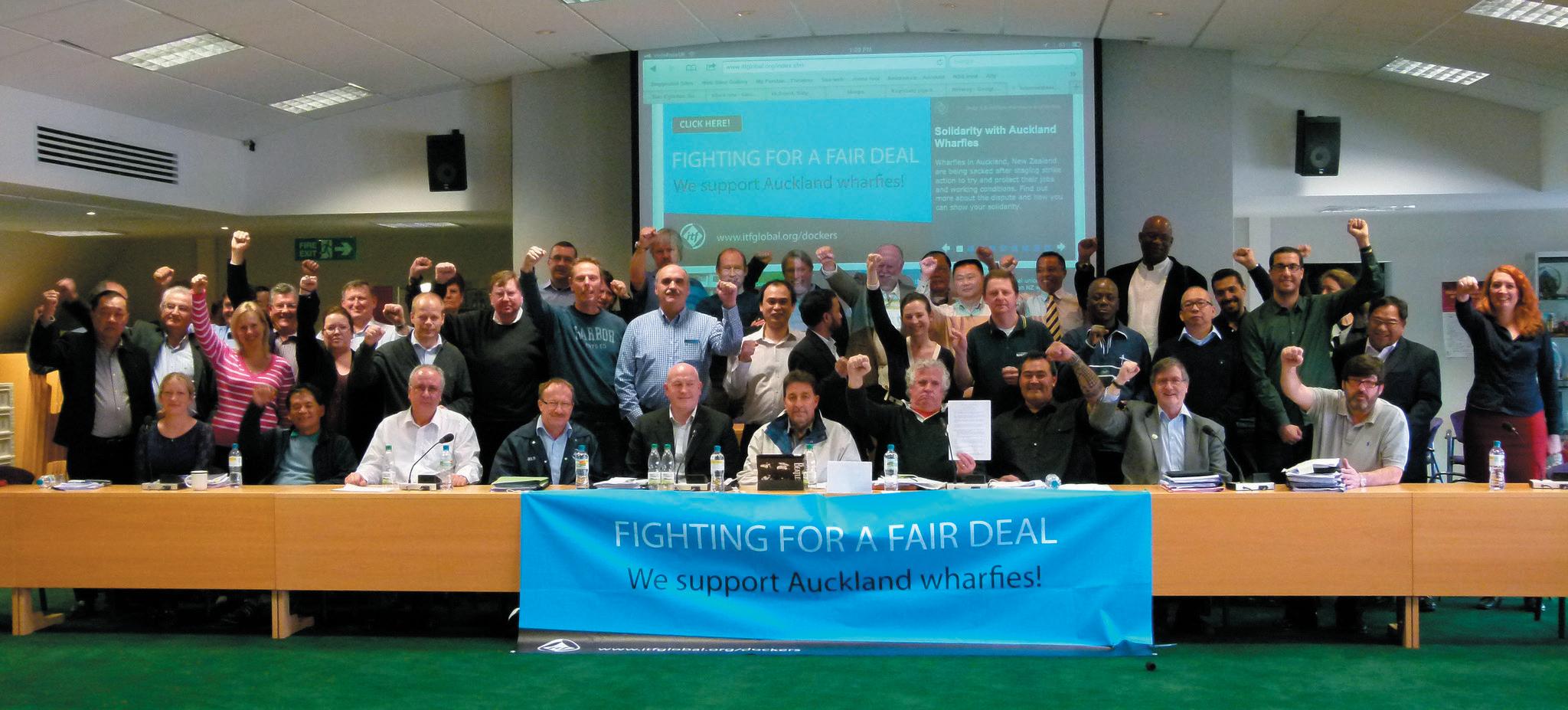 international support co-ordinated by the ITF. The presence and support of the global family of dockworkers and trans port workers was a massive boost to our campaign. The list is long but includes the support of the MUA, ETU, ILWU, and affiliates throughout the world. Thank you for your support and solidar ity. We couldn’t have done it without you. Last of all, thanks to the officials and rank and file members at Ports of Auckland who stood strong under difficult circum stances. In the end, our cause prevailed.