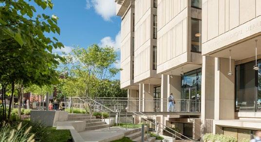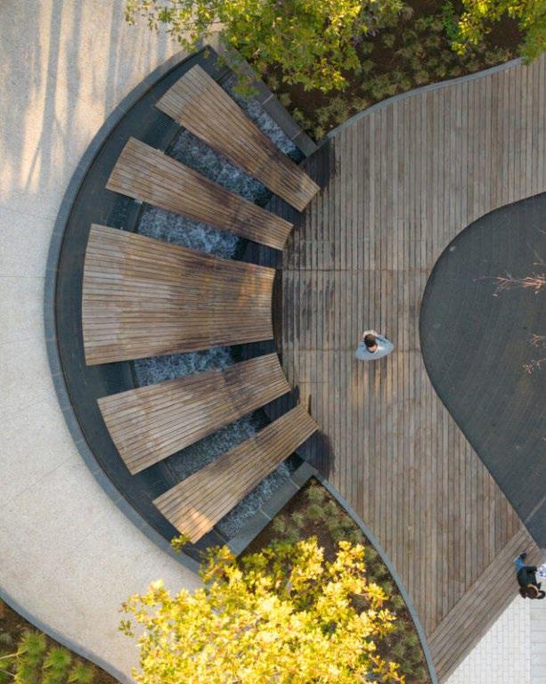 The design elevates the gardens approximately five feet above the base flood elevation, allowing them to manage runoff from a 200year storm while maintaining accessibility and visual continuity with the surrounding campus. This strategy enables the landscape to act as both infrastructure and amenity, protecting research investments while offering a lush, immersive environment for daily use. Realizing the project required careful grading and coordinating the water feature functionality.