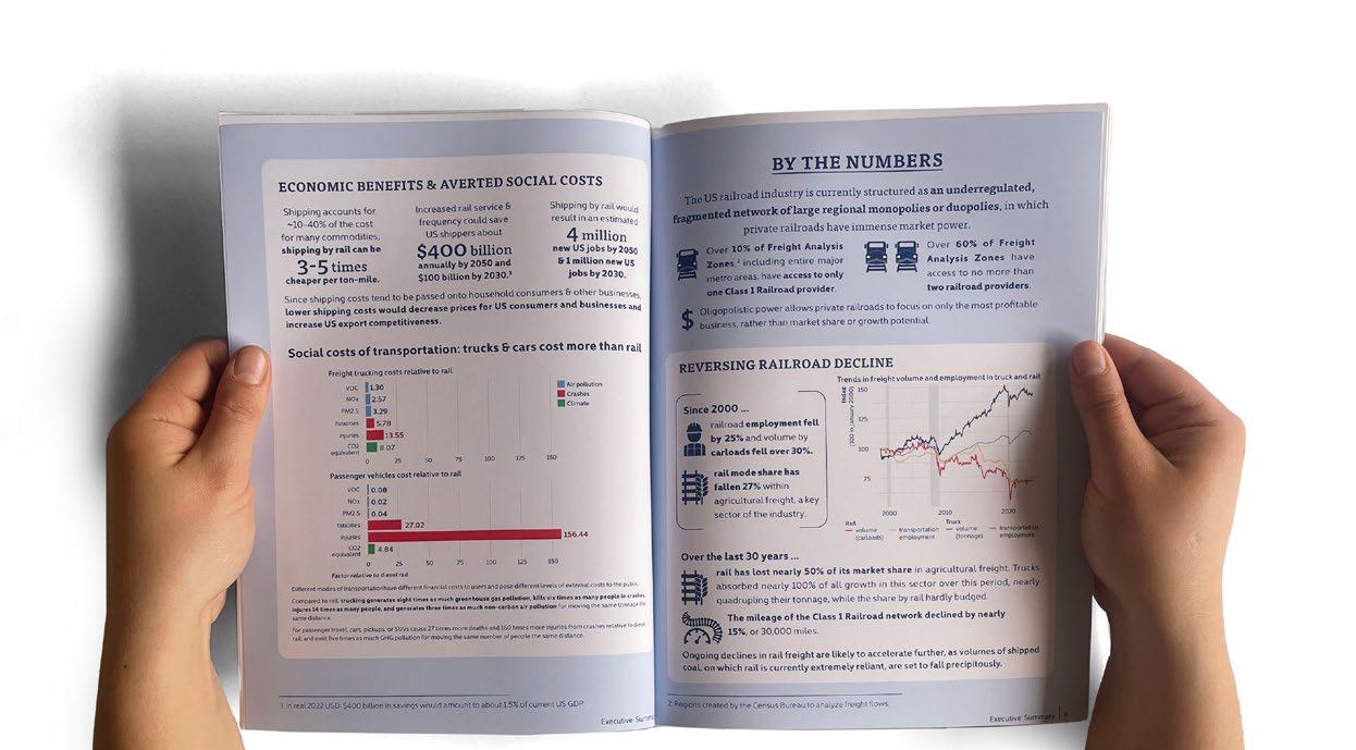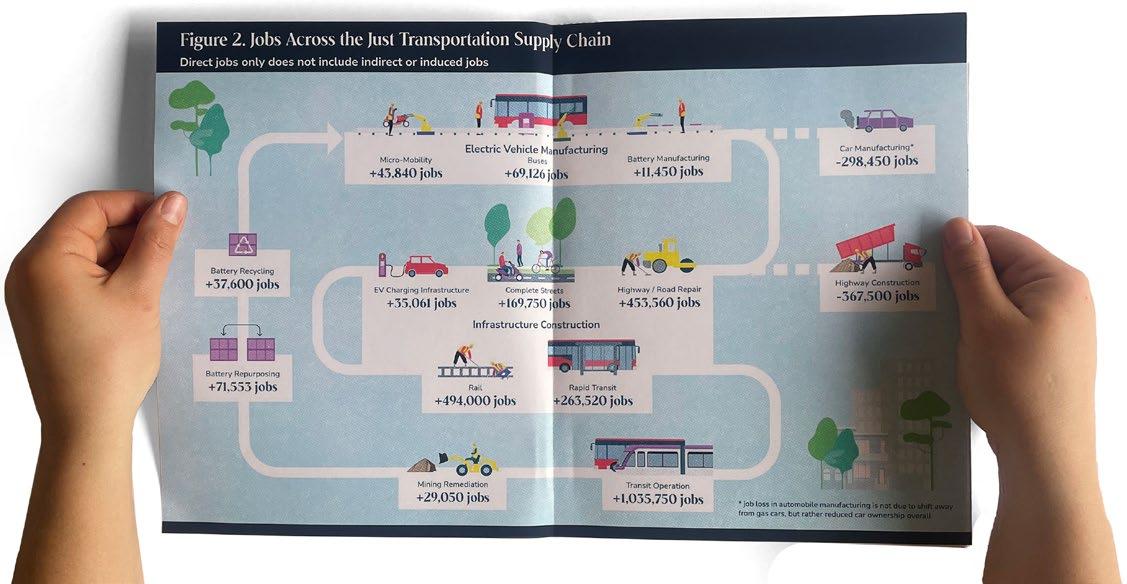 Clear and engaging visual communication is essential for translating complex data into accessible narratives that resonate with the public and influence policymakers. The two reports featured here focus on advancing a transportation system within the US that supports both economic resilience and climate stability. The first report models how a diversified, pro-worker, pro-community transportation system could generate jobs across the supply chain—revealing the broader economic and social gains of transitioning away from a car-dominated, electricvehicle-only future. The second, in partnership with Rail Workers United, examined the economic advantages of transitioning rail network ownership from private corporations to public hands.