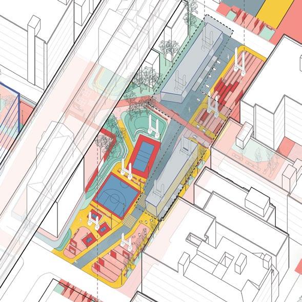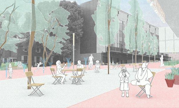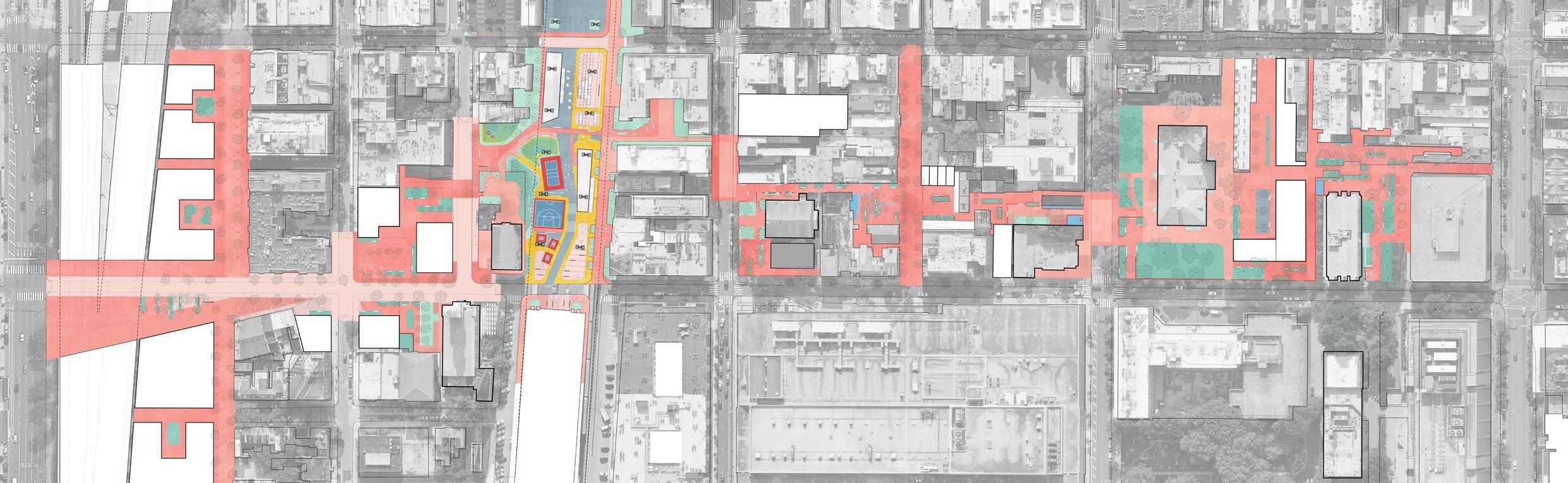 Underutilized lots adjacent to the path are reimagined as spaces for play, rest, and cultural expression—encouraging surrounding businesses to face inward and engage the new corridor.