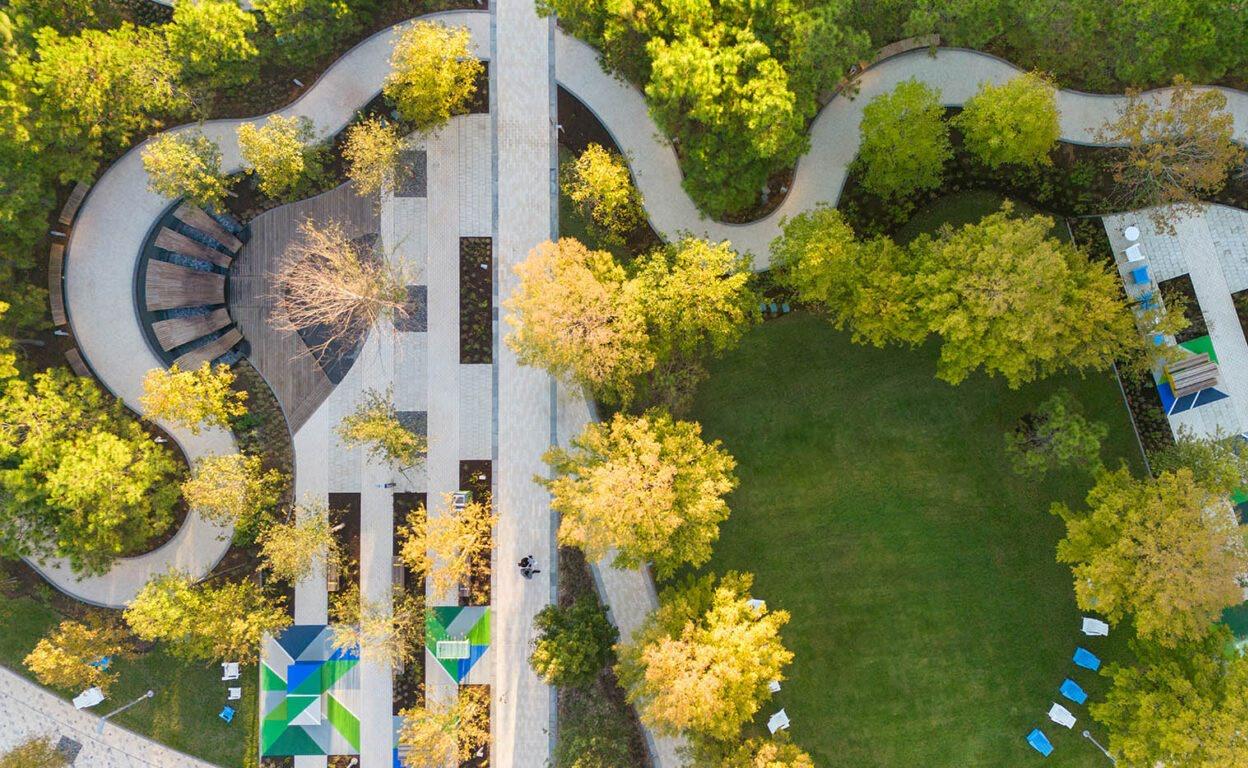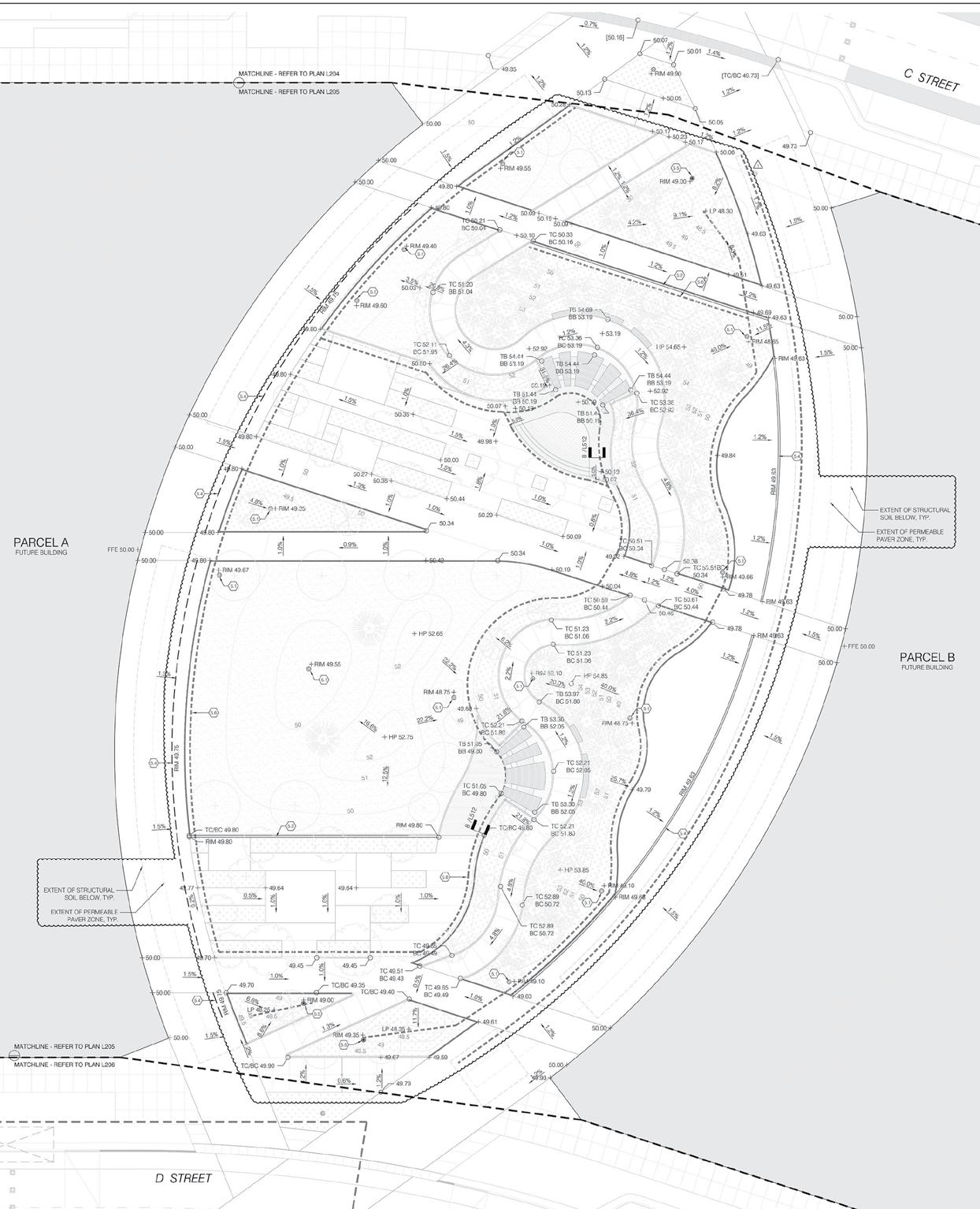 Located within the Brays Bayou floodplain, the Texas Medical Center’s research campus is situated in an area highly vulnerable to flooding. In response, the landscape is designed not just to withstand water— but to embrace it. A continous sequence of gardens weaves through the campus, functioning both as a vibrant public realm and as a performative landscape that accommodate water during major storms. The accompanying pages illustrate the grading plan and construction details for one of the central gardens.