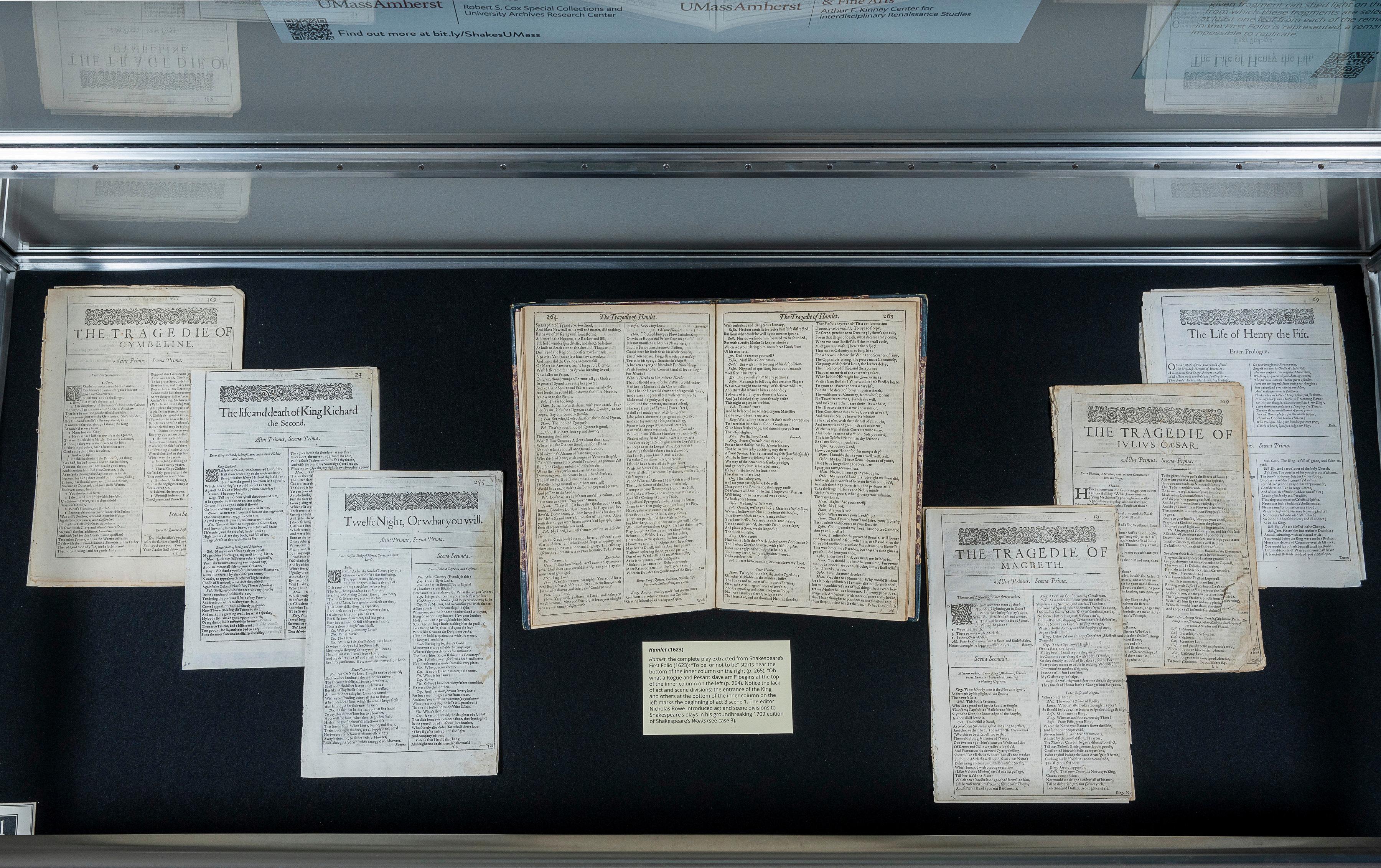 This year marks the 400th anniversary of the publication of the First Folio of William Shakespeare’s plays (1623). At the W.E.B. Du Bois Library and Kinney Center for Interdisciplinary Renaissance Studies, the Shakespeare Unbound exhibit asks: what happens when Shakespeare appears in fragments or as momentary flashes in history? This campus-wide exhibit explores stories of Shakespeare unbound and rebound, scattered and gathered together into new assemblages across place and time.