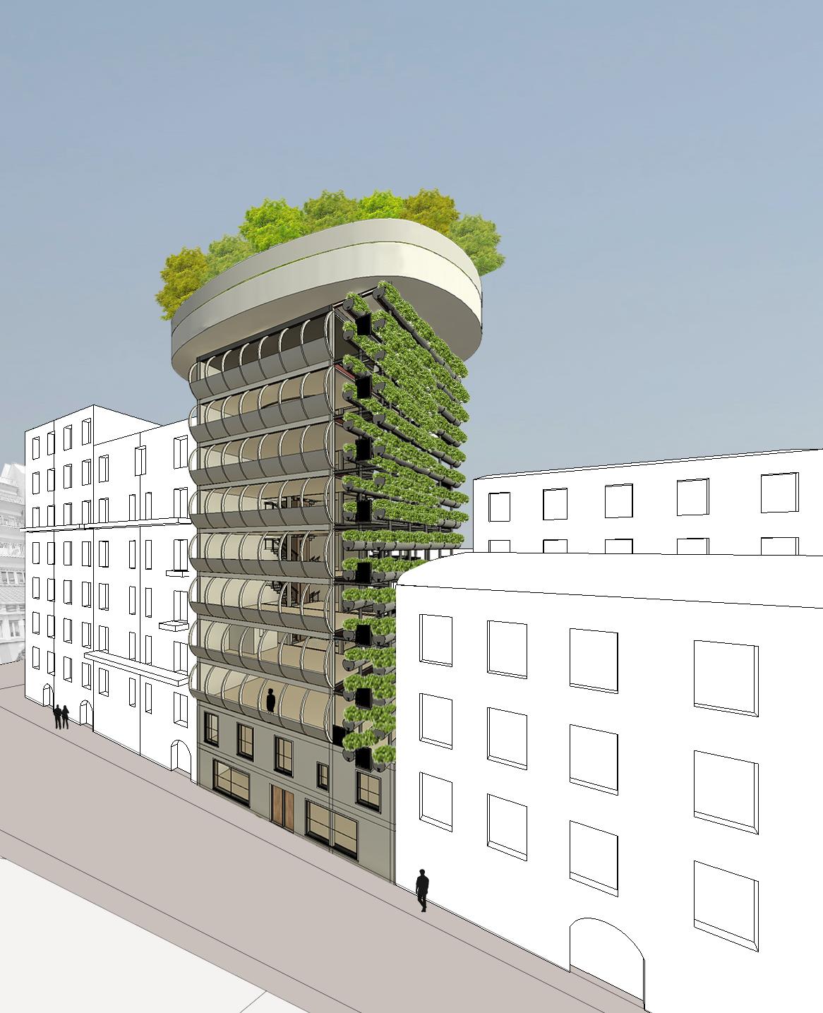 Proposal for a mixed-use high-rise building with coworking and community gardening in Les Batignolles
