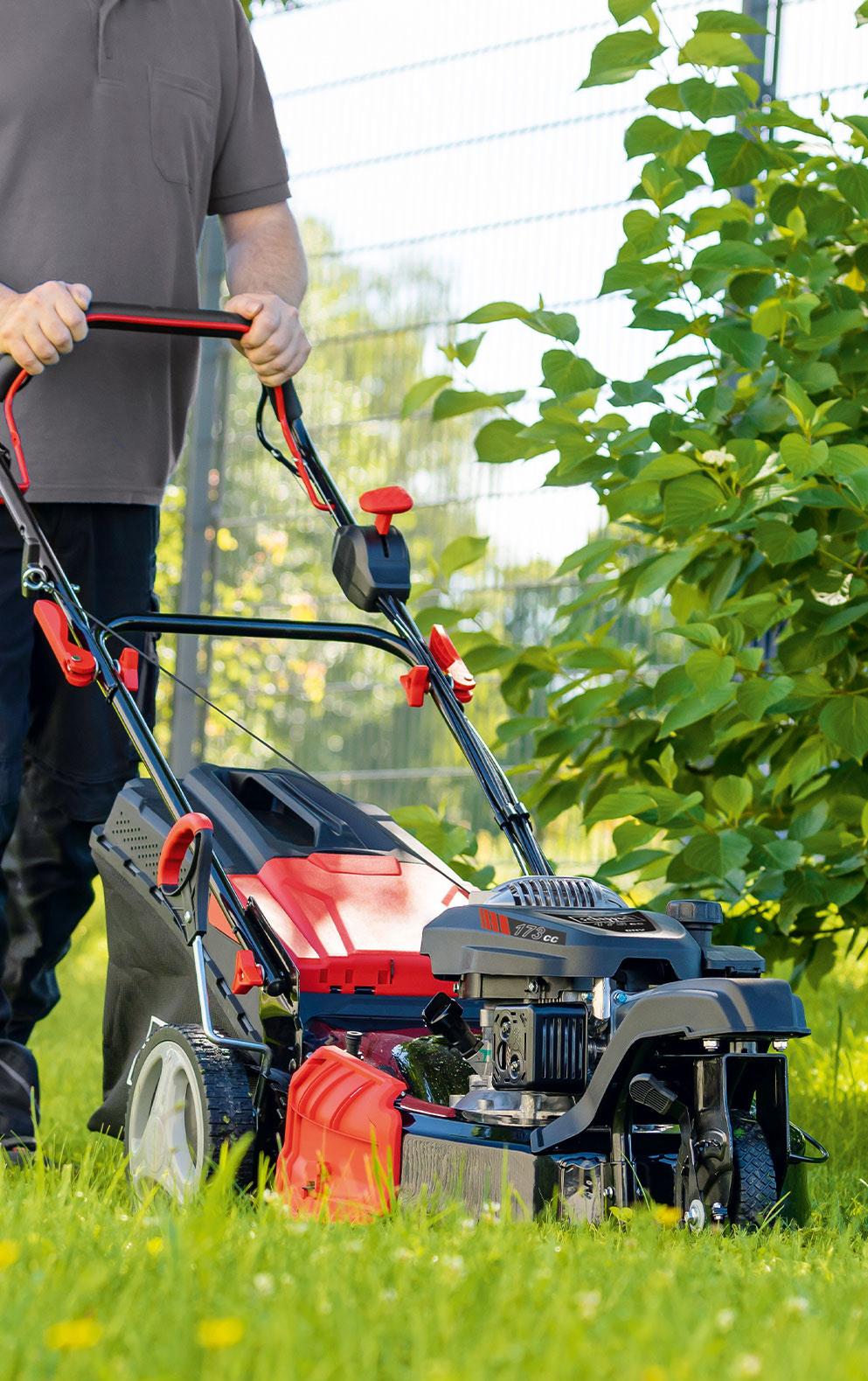 La roue avant multidirectionnelle assure à la machine une grande agilité pour tourner autour des arbres, des massifs, des haies. ✓ Bac de ramassage 65L ✓ Avec fonction mulching ✓ Carter et lame en acier