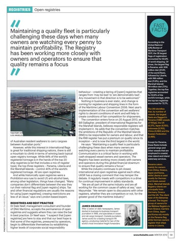 of Australian resident seafarers to carry cargoes between Australian ports.” However, while this interest in international flags is great for traditional shipping nations, there is still a mountain to climb in terms of winning back typical open registry tonnage. While 84% of the world’s registered tonnage is in the hands of the top 20 ship registries (a list that includes a mix of register type), the top three registers – Panama, Liberia and the Marshall Islands – control 40% of the world’s registered tonnage. All are open registries. And while historically open registries were a Prohibition-era ruse to avoid US anti-alcohol laws, among other legislation, things have changed. “Many companies don’t differentiate between the way they run their national flag and [open registry] ships. Tax and other financial regulations are usually the reasons for using [open registries]; crewing restrictions are less of an issue,” says one London-based expert. REGISTRIES AND BEST PRACTICE Dr Dale Neef, management consultant and founder of DNA Maritime, accepts the permanence of open registries and suggests where they can raise the bar in best practice. Dr Neef says: “I suspect that [open registries] are here to stay and that our best hope is that some of the registries, pressured by operators, begin to differentiate themselves by establishing higher levels of corporate social responsibility