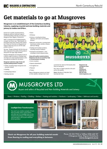 Get materials to go at Musgroves Musgroves is an established part of the Canterbury building industry, supplying recycled and new building materials and joinery to tradies and DIYers. Known for its quality recycled products, Musgroves stocks an extensive range of reclaimed building materials at its yard at 3 Musgrove Close, Wigram, Christchurch. With 1.3 hectares full of building products, manager Sue Brown says, “Most people can find exactly what they need for their project, but if they can’t the team at Musgroves are happy to keep their eye out until the right product comes in.” She says, “People visiting for the first time are often surprised at the quality of the products along with the huge range available.” Buying at Musgroves not only gives access to a diverse range of products, including many rare finds, but using recycled products is also cost-effective and good for the planet. Musgroves' extensive range of new and recycled building products includes: • Timber, including tongue and groove and character timbers • Cladding • Landscaping products • Roofing materials