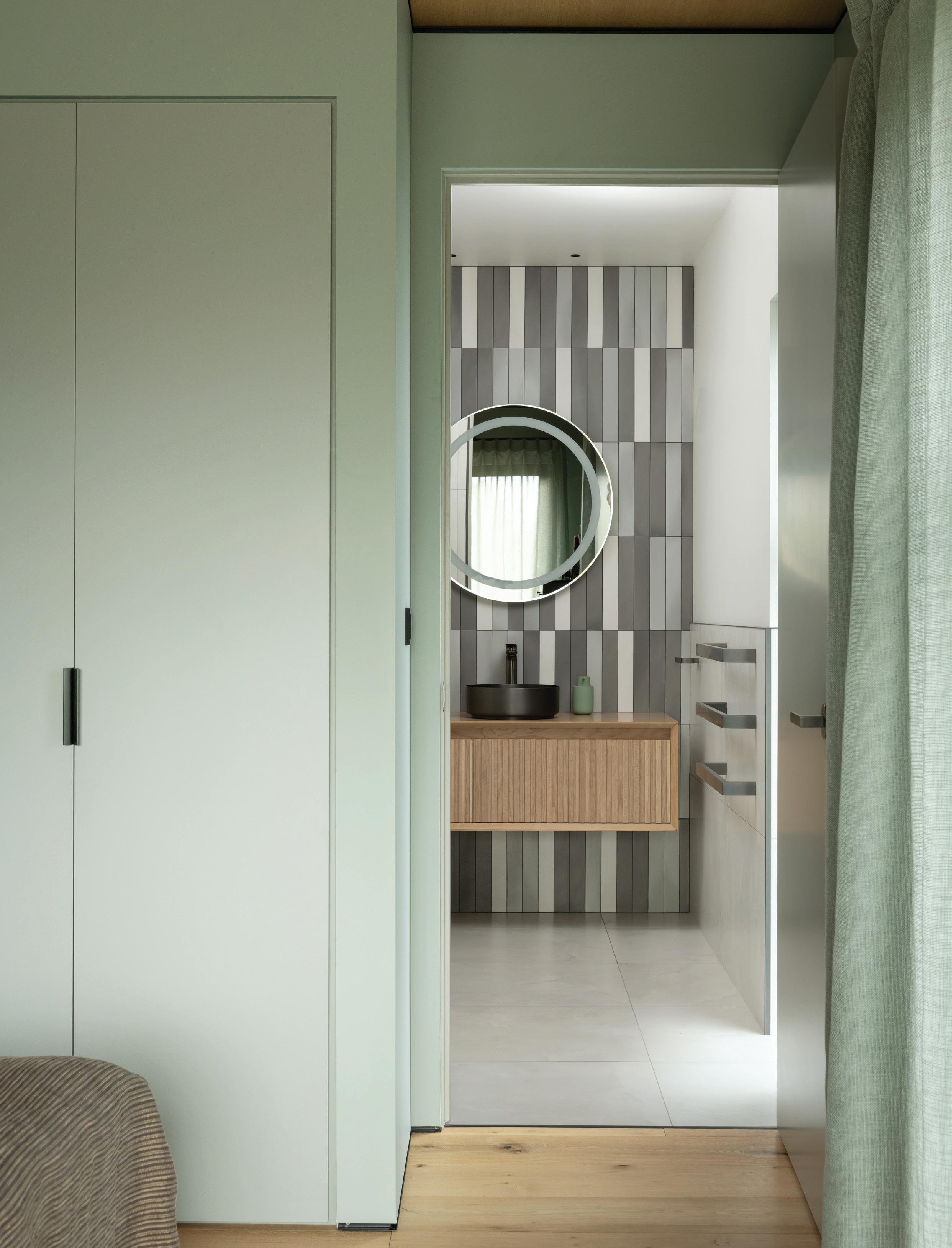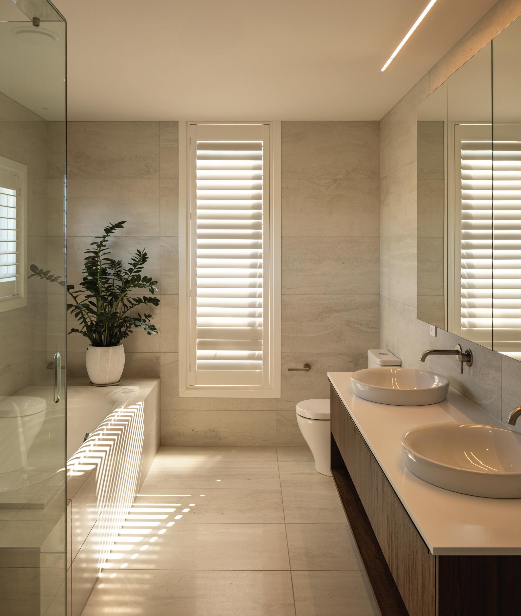 The ensuite’s Urban 2.0 double vanity from Mico is a standout in the space, with its oak finish and wall-hung design pairing seamlessly with polished tiles to create a refined, modern atmosphere.