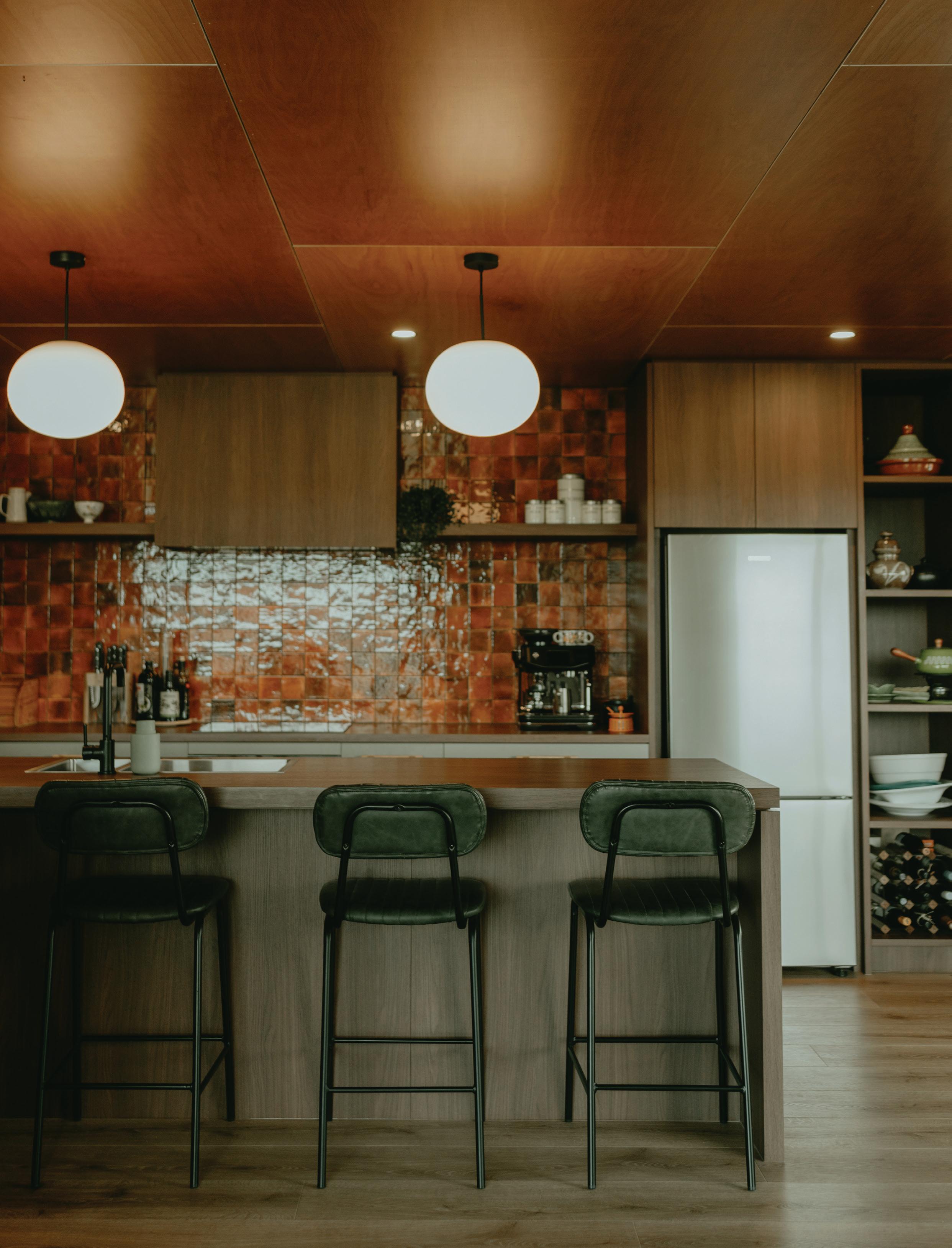 Nazareth Joinery selected American oak veneer pressed on to birch plywood for the kitchen cabinetry to replicate the ceiling linings and create a strong visual connection throughout the space. The exposed plywood edges are a standout design feature, adding warmth and texture to the overall aesthetic.