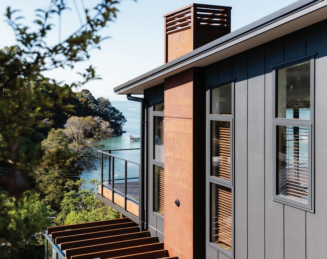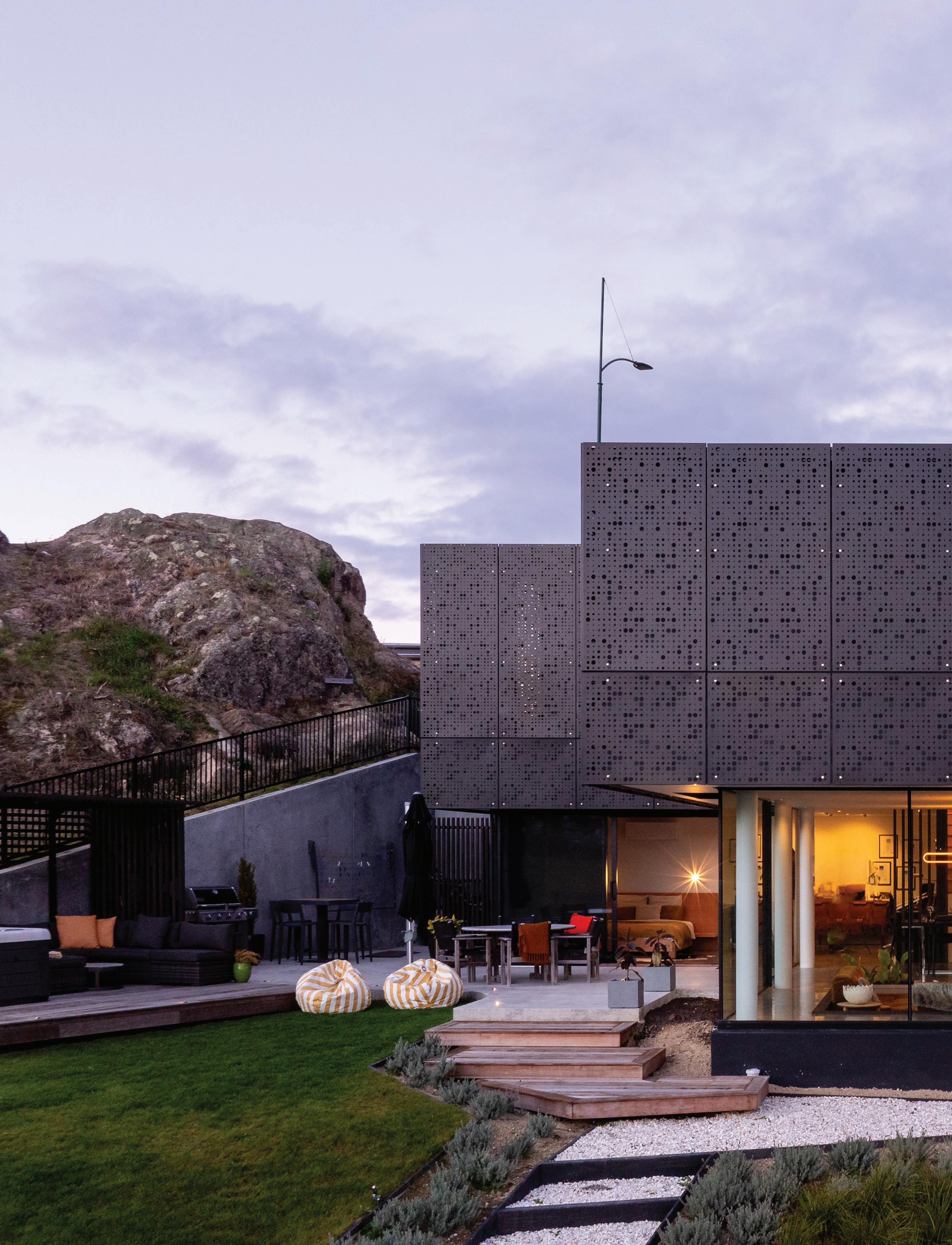 The main challenge, he adds, was the narrow and steep site. To overcome this, the team had to construct a six-metrehigh retaining wall driven six metres into the hillside. “We had to work from the top down, cutting dirt away as we worked towards the ground level before starting the house. We had to be strategic when working out this plan, as it also consisted of using hiabs to lift diggers up and down the hill to backfill the retaining wall.”