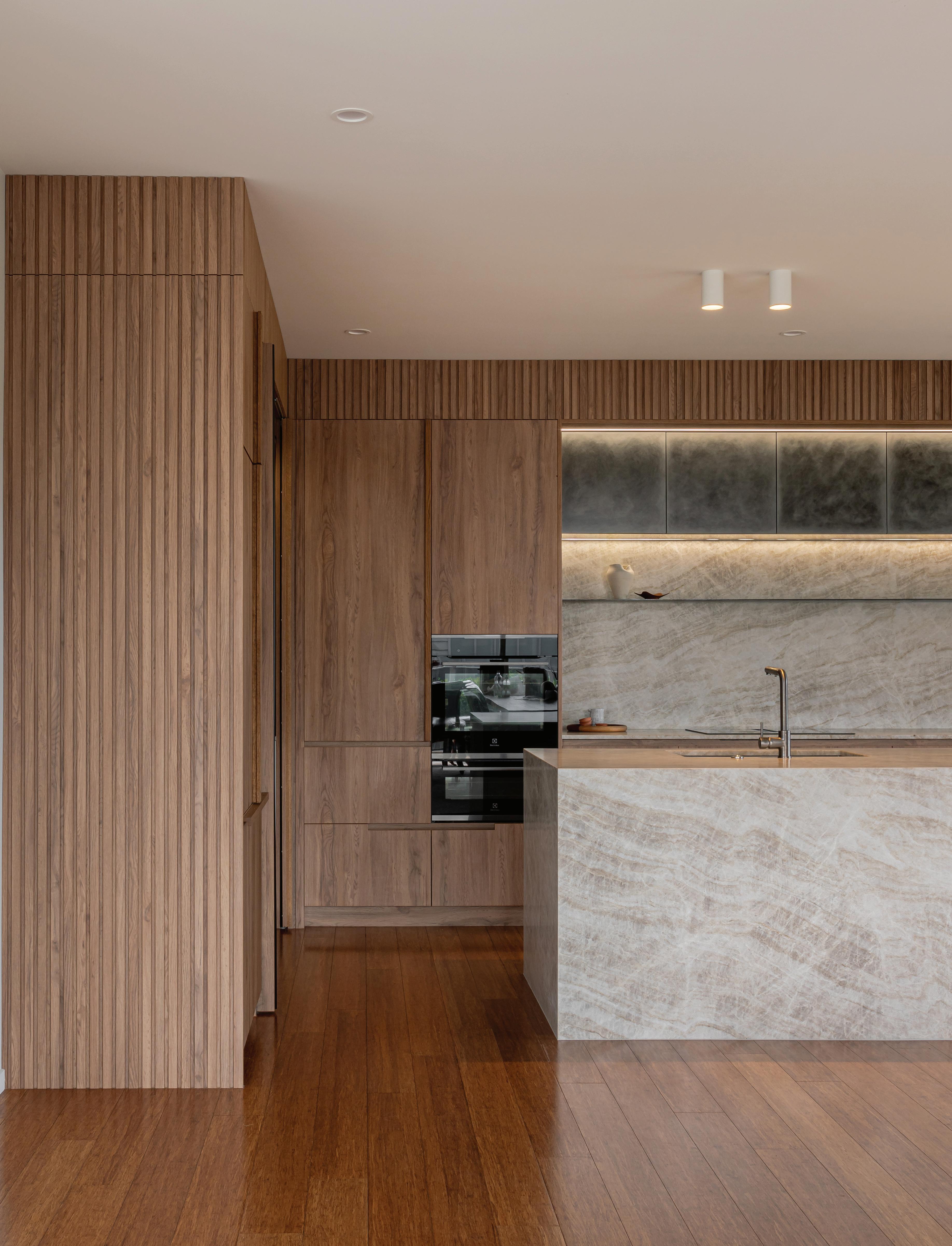 of veneer and solid timber brought depth and contrast to the space while maintaining a consistent material palette.