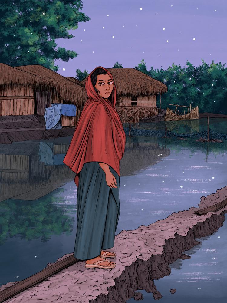 “This digital art piece was inspired by a photograph taken by Tim McDonnell of a woman in Gabura, Bangladesh who lost her home due to storms caused by climate change. Climate change is disproportionately affecting the Sundarbans region of Bangladesh, forcing local communities who hold deep ties to their natural environment to migrate as climate refugees. As a Bangladeshi artist, I wanted to use this piece to raise awareness about the issue. After all, our natural environments and cultural spaces are one and the same: the destruction of one means the destruction of the other.”