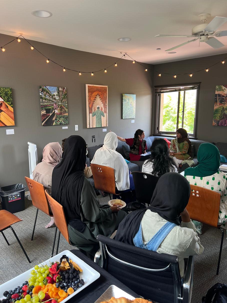 Walking into the no-longer-empty Markaz, you can see that time has passed Posters keep a comprehensive record of Chai Chats featuring notable authors, academics, and organizers. The formerly blank walls hold student art, a vivid portrait of a mother in a garden and a textile piece that reflects on “TO BE MUSLIM IN AMERICA." The center has grown and reimagined itself exactly as intended. Ten years ago, every Tuesday for Afternoon Chai, a student or two would rummage out loose tea bags, boil hot water, and pour out a milk carton. Now that same simple social hour requires a week’s worth of planning and large steaming carafes of chai. Rotating snacks such as roti canai, xalwa, gulab jamun make each week unique, reflecting the diverse identities and cultures of the community.