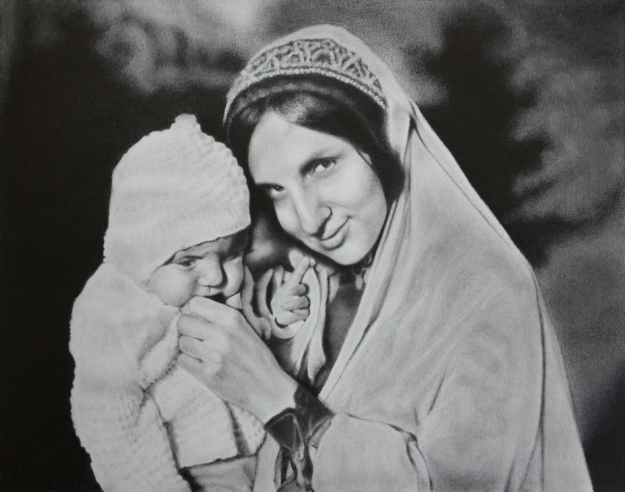 “This piece centers around memory and, specifically, maintaining community through memory. It depicts Nahid Hatami and her daughter Noushin during the summer of 1969 in their native village in Iran. The two later fled persecution to the United States, the memory of their village and their community there kept alive by stories and a single blurry photograph. I drew this piece in graphite to preserve and share this memory and their story.”