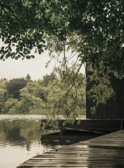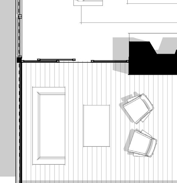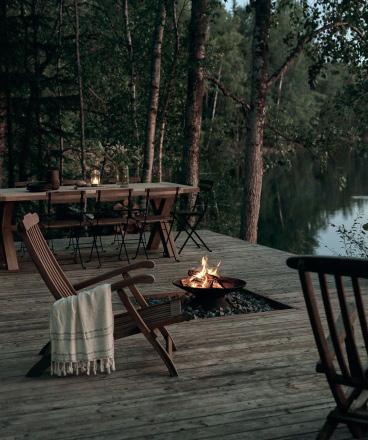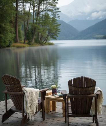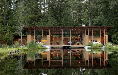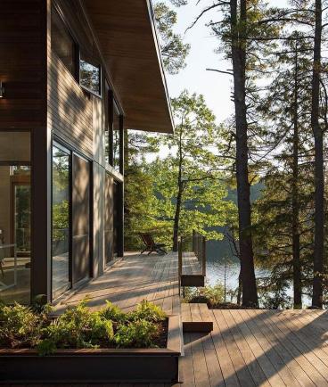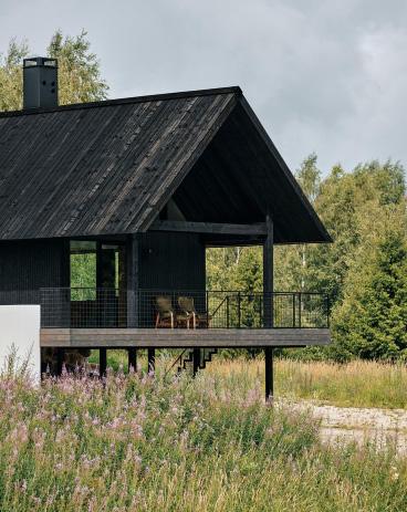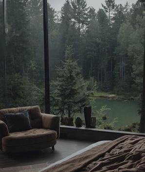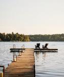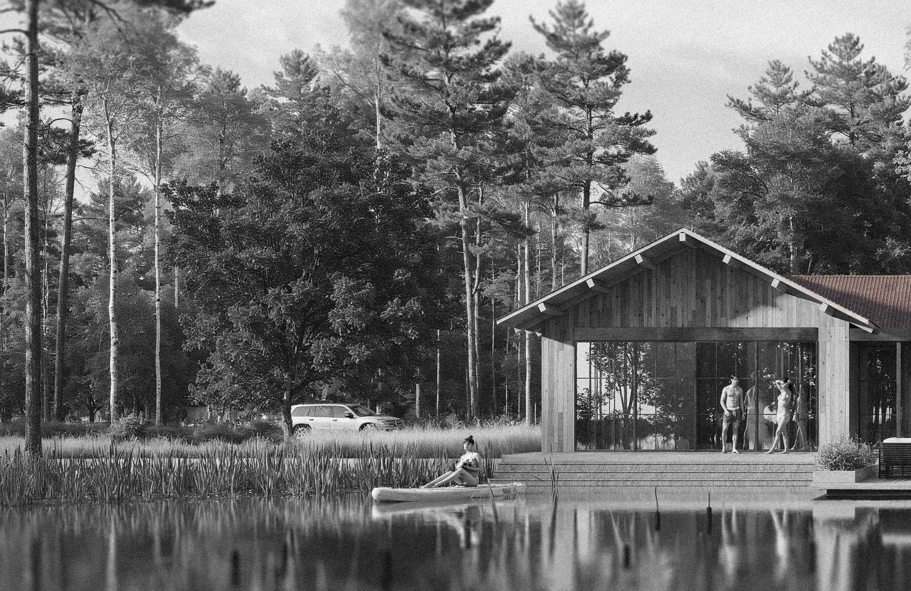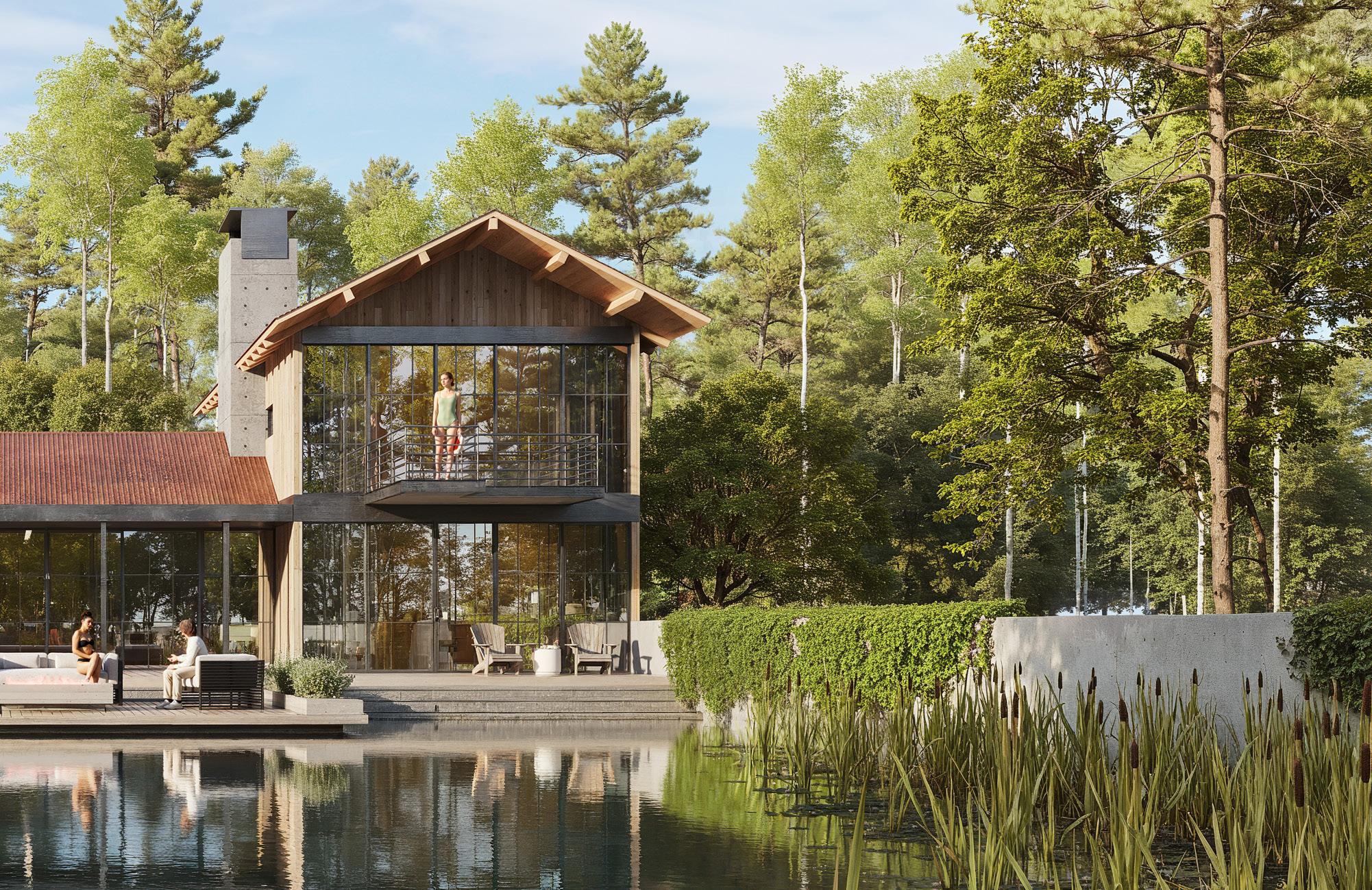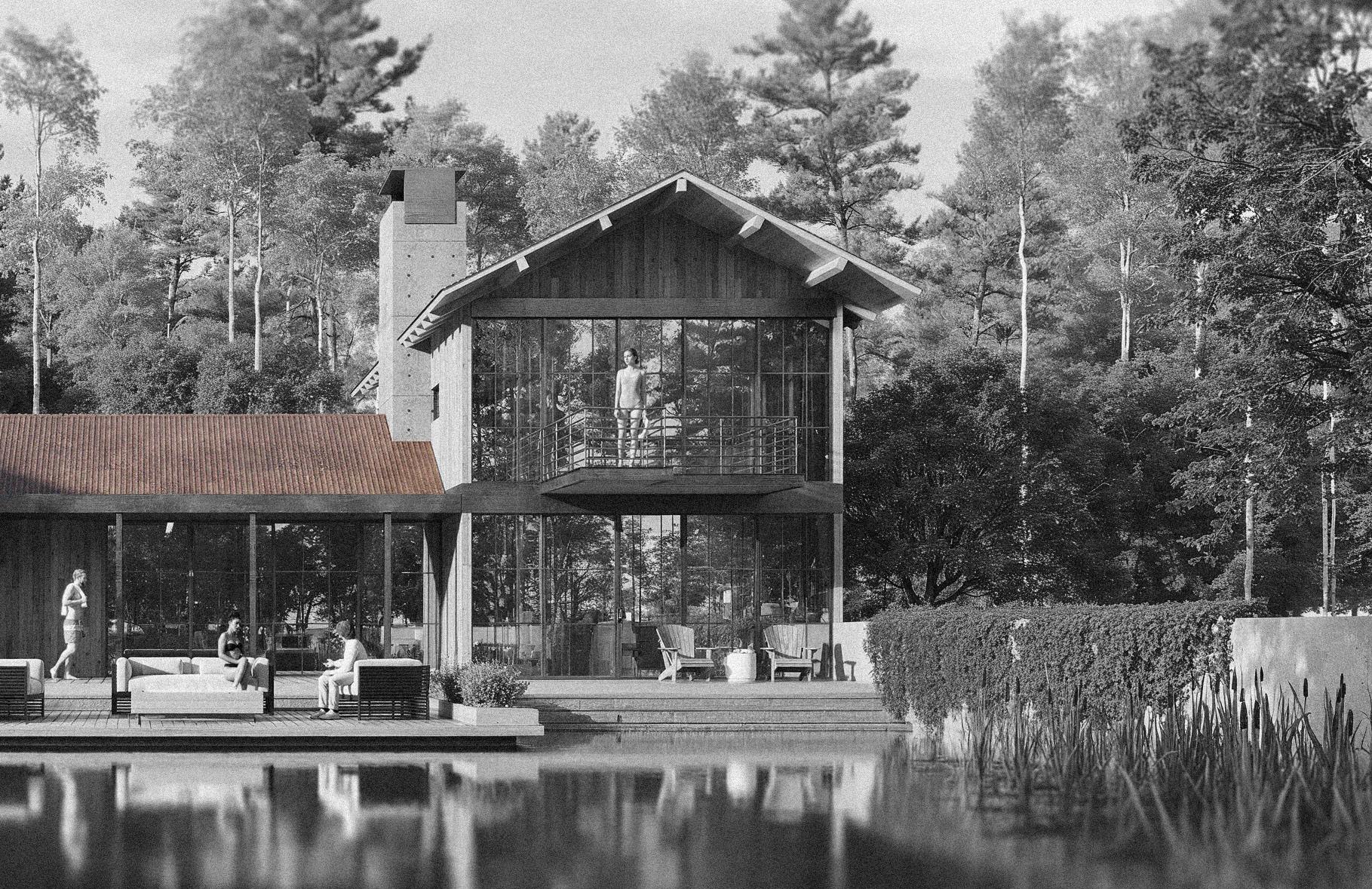 A glass connector links the two gabled volumes, framing nature and housing the living and dining areas that open to a private backyard. One volume holds the bedrooms, the other the garage, kitchen, and service spaces. A lakeside deck with a fire pit and seating blends architecture with the landscape. Homestead embodies retreat, reflection, and connection to the land, true to Kingbird’s vision.