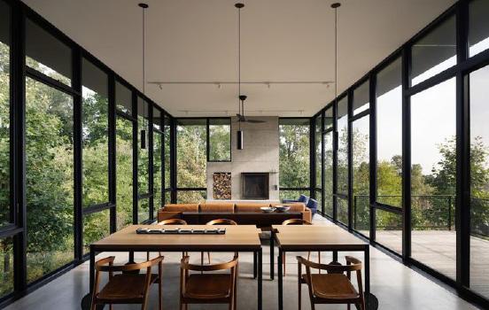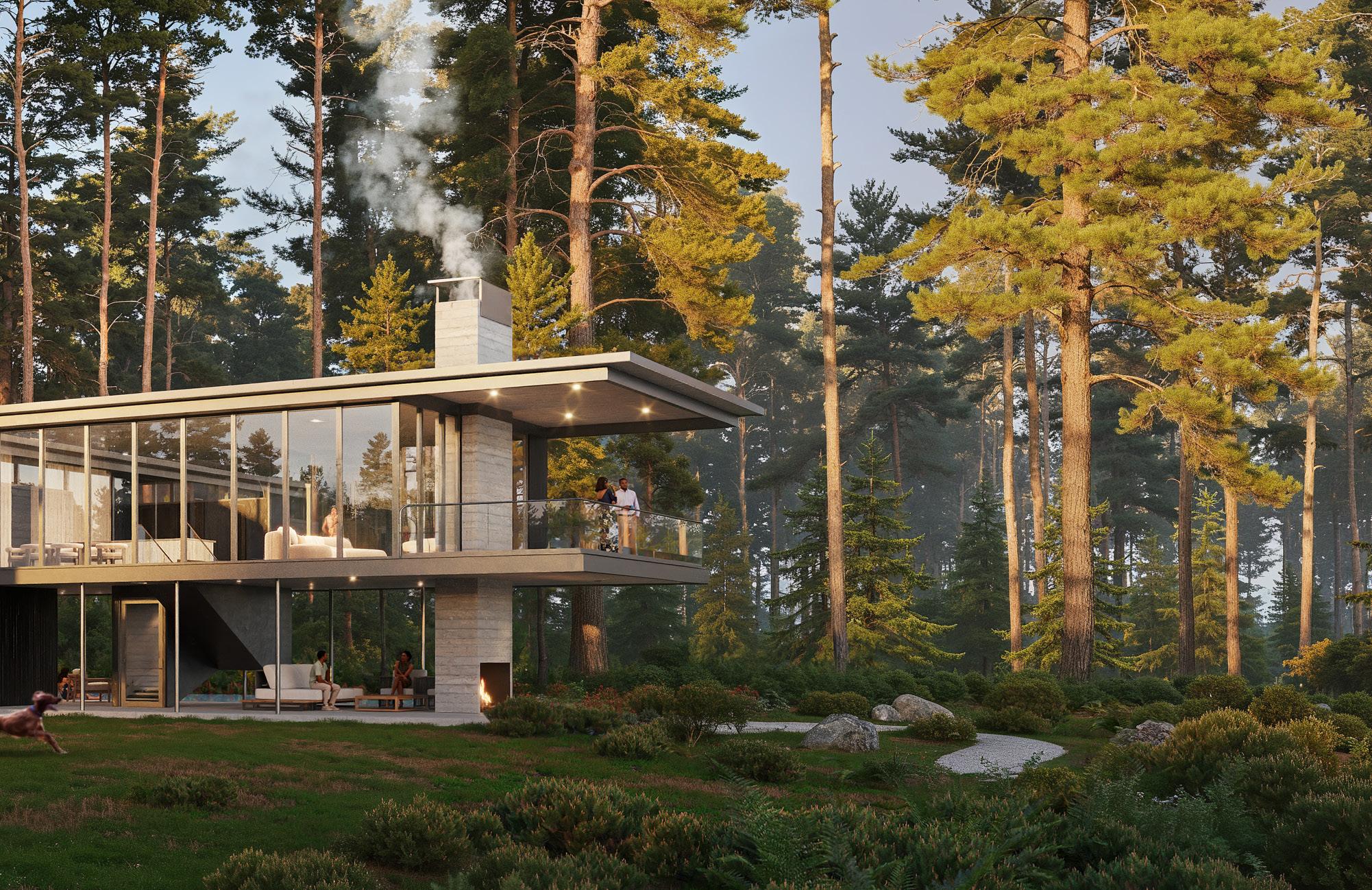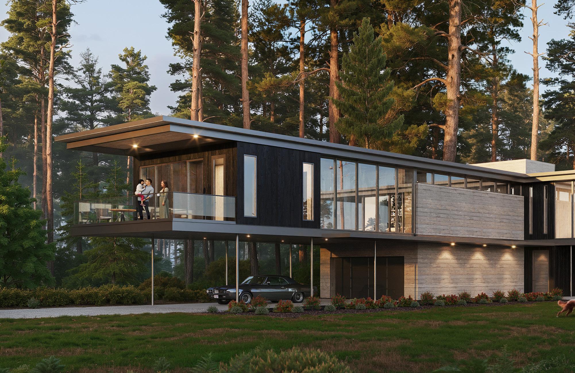 Divided into two wings, Canopy separates private and public spaces. One wing contains the bedrooms, with a primary suite facing a detached guest residence. The other holds the kitchen, dining, and living areas, centered around a striking concrete fireplace that extends to a lakeside balcony. Blending minimalism and bold design, Canopy reflects Kingbird’s vision: purposeful land use, elevated lifestyle, and design freedom.