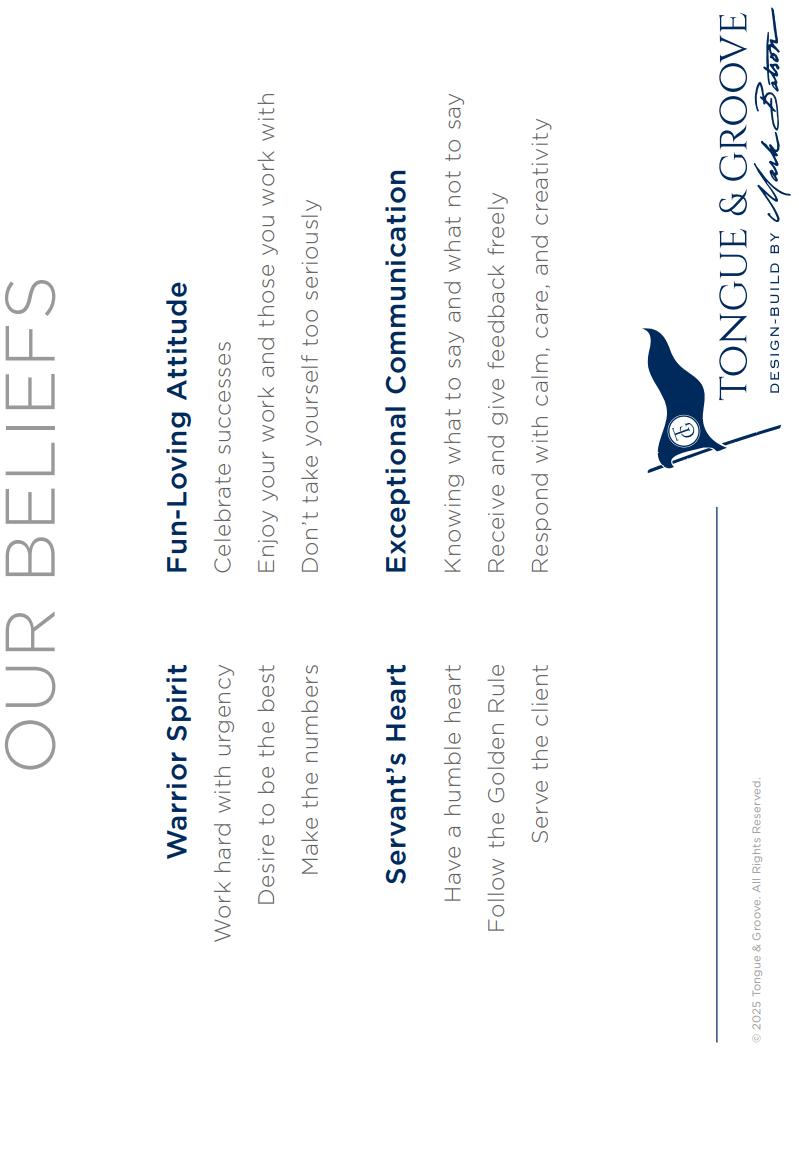 What has meant the most to me over the years are the relationships we’ve built along the way. Many of you have become lifelong friends, coming back not only for the quality of our craft, but for the care you feel throughout the process. That connection is what sets Tongue & Groove apart. Great homes are built on trust, and trust is built through relationships. I’m especially proud of what Sam Roy has accomplished with our Property Services division. Under his leadership, it has grown into a trusted, white-glove service that gives our clients unmatched peace of mind. This year, it was my honor to name Sam a partner in Tongue & Groove—a recognition of his loyalty, leadership, and heart.