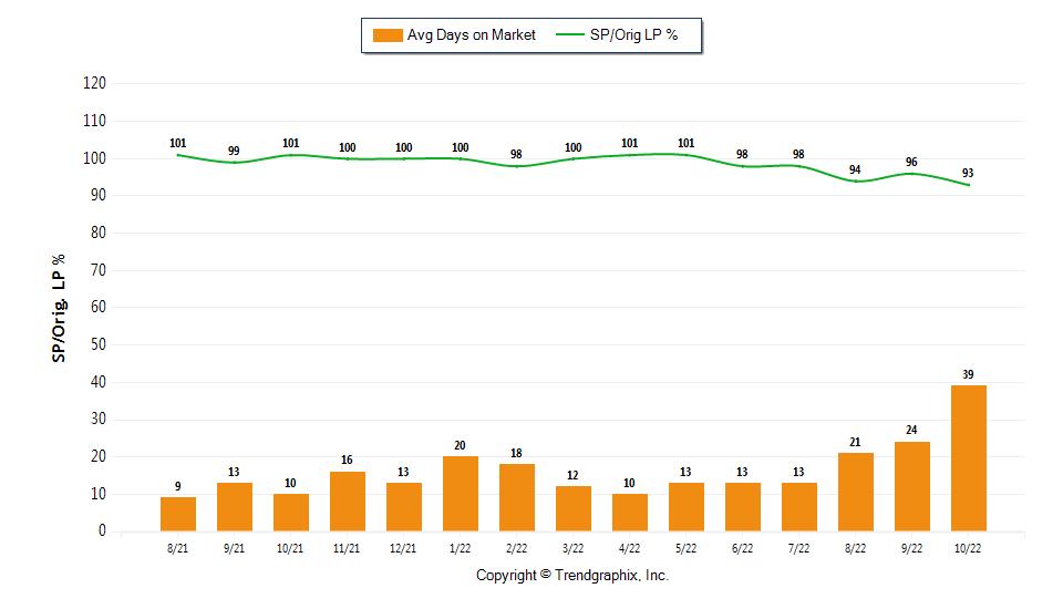 Curnt vs. Prev Month Curnt vs. Same Month 1 Yr Ago Curnt vs. Same Qtr 1 Yr Ago Oct. 22 Sep. 22 % Change Oct. 22 Oct. 21 % Change Aug. 22 to Oct. 22 Aug. 21 to Oct. 21 % Change Avg Days on Market 39 24 62.5% 39 10 290% 28 11 154.5% Sold/Orig LP Diff. % 93 96 -3.1% 93 101 -7.9% 94 100 -6% TODAY’S STATS Current vs. Prev MTD Current vs. Same MTD 1 Yr Ago Current vs. Prev YTD 11/1/22 - 11/8/22 10/1/22 - 10/8/22 % Change 11/1/22 - 11/8/22 11/1/21 - 11/8/21 % Change 1/1/22 - 11/8/22 1/1/21 - 11/8/21 % Change Avg Days on Market 33 32 3.1% 33 14 135.7% 18 26 -30.8% Sold/Orig LP Diff. % 96 94 2.1% 96 102 -5.9% 98 100 -2%
