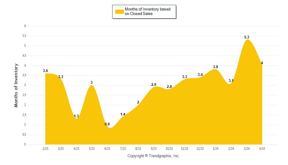 The April 2024 Months of Inventory based on Closed Sales of 4 was increased by 202.5% compared to last year and down 24.6% compared to last month. April 2024 was Neutral market.