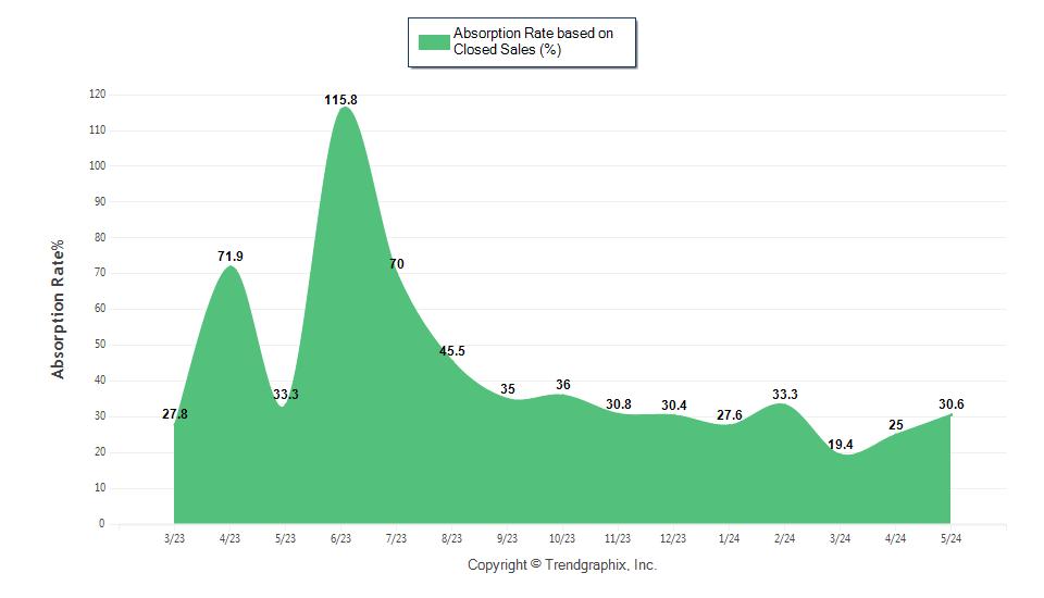 The May 2024 Absorption Rate based on Closed Sales of 30.6 was decreased by 8.1% compared to last year and up 22.4% compared to last month.