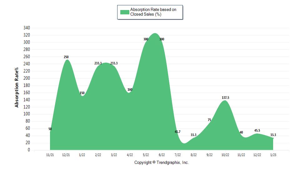 The January 2023 Absorption Rate based on Closed Sales of 33.3 was decreased by 77.8% compared to last year and down 26.8% compared to last month.