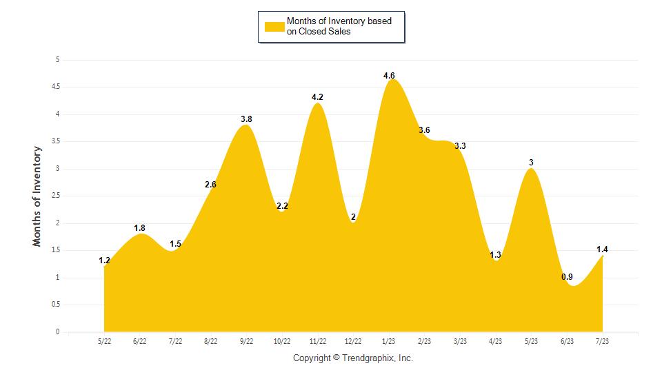 The July 2023 Months of Inventory based on Closed Sales of 1.4 was decreased by 6.7% compared to last year and up 55% compared to last month. July 2023 was Seller's market.