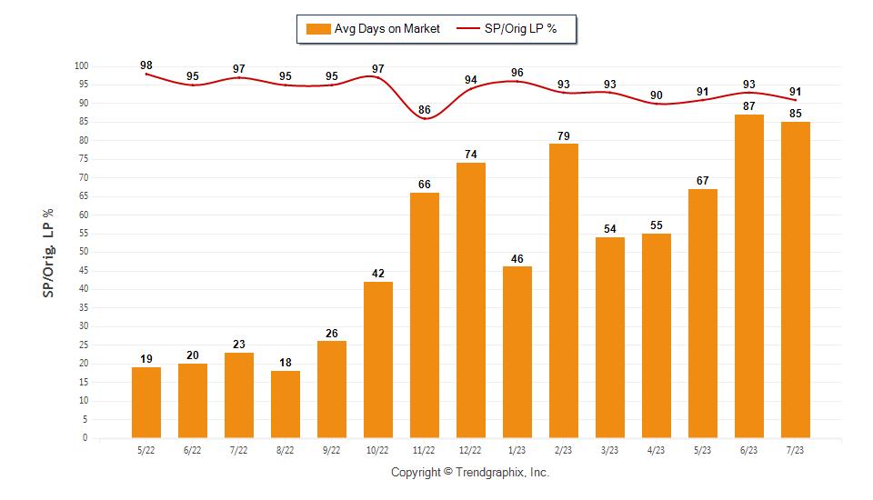 The average Days on Market (DOM) shows how many days the average property is on the market before it sells. An upward trend in DOM trends to indicate a move towards more of a Buyer’s market, a downward trend indicates a move towards more of a Seller’s market. The DOM for July 2023 was 85, down 2.3% from 87 days last month and up 269.6% from 23 days in July of last year.