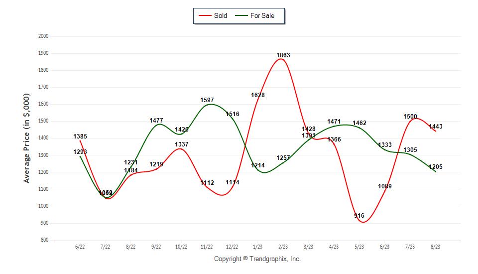The Average Sold Price in August was $1,443,000, up 21.9% from $1,184,000 in August of 2022 and down 3.8% from $1,500,000 last month.
