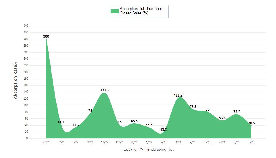 The August 2023 Absorption Rate based on Closed Sales of 38.5 was increased by 15.6% compared to last year and down 47% compared to last month.