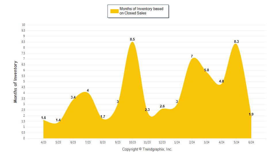 The June 2024 Months of Inventory based on Closed Sales of 1.9 was decreased by 44.1% compared to last year and down 76.8% compared to last month. June 2024 was Seller's market.