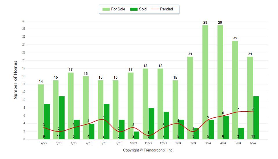 June 2024 was a Seller's market! The number of for sale listings was up 23.5% from one year earlier and down 16% from the previous month. The number of sold listings increased 120% year over year and increased 266.7% month over month. The number of under contract listings was the same compared to previous month and up 133.3% compared to previous year. The Months of Inventory based on Closed Sales was 1.9, down 44.1% from the previous year.