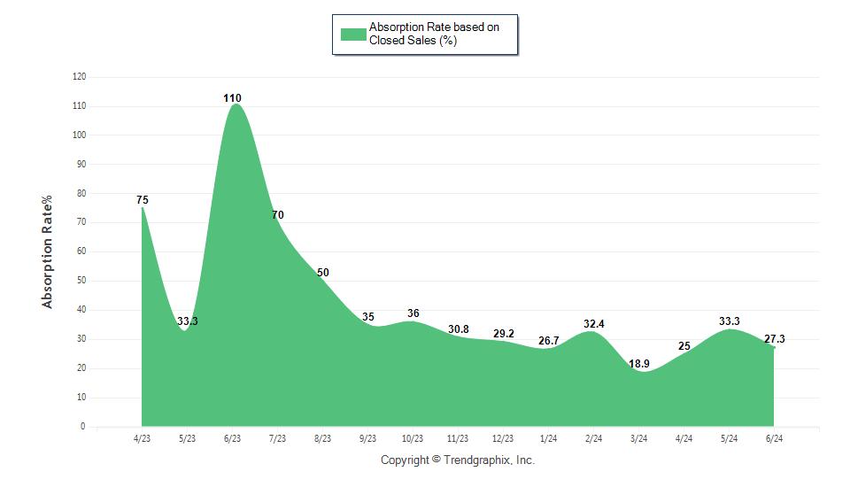 The June 2024 Absorption Rate based on Closed Sales of 27.3 was decreased by 75.2% compared to last year and down 18% compared to last month.