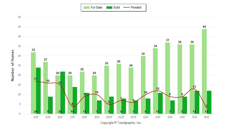June 2024 was a Neutral market! The number of for sale listings was up 120% from one year earlier and up 22.2% from the previous month. The number of sold listings decreased 45.5% year over year and the same month over month. The number of under contract listings was down 76.9% compared to previous month and down 80% compared to previous year. The Months of Inventory based on Closed Sales was 3.7, up 308% from the previous year.