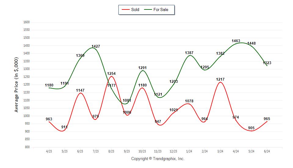 The Average Sold Price in June was $965,000, down 15.9% from $1,147,000 in June of 2023 and up 6.6% from $905,000 last month.